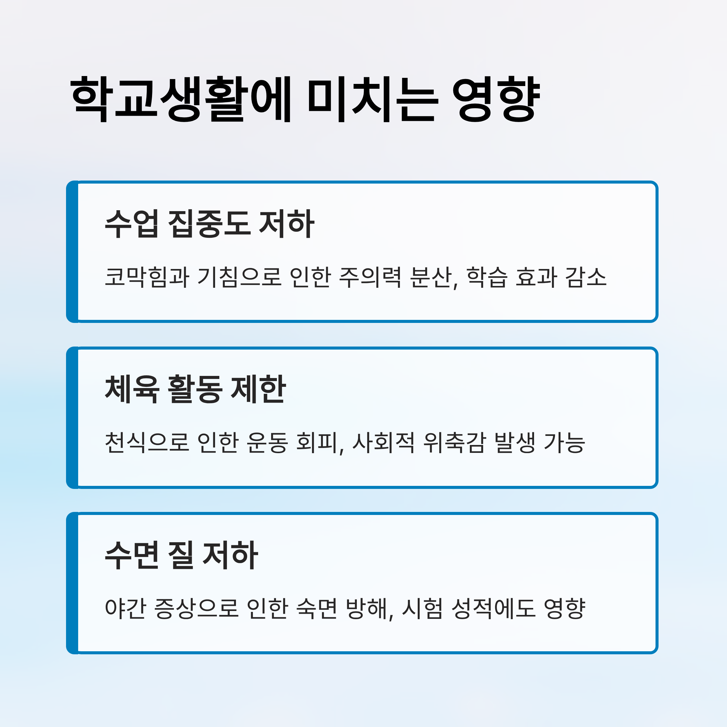 청소년기의 알레르기 질환은 단순한 건강 문제를 넘어서 일상과 학업, 정서에까지 영향을 줘요. 비염이나 천식으로 인해 집중력이 떨어지면 수업 시간에 학습 효과가 낮아지고, 반복되는 증상은 친구들과의 관계나 자존감에도 영향을 줄 수 있어요.