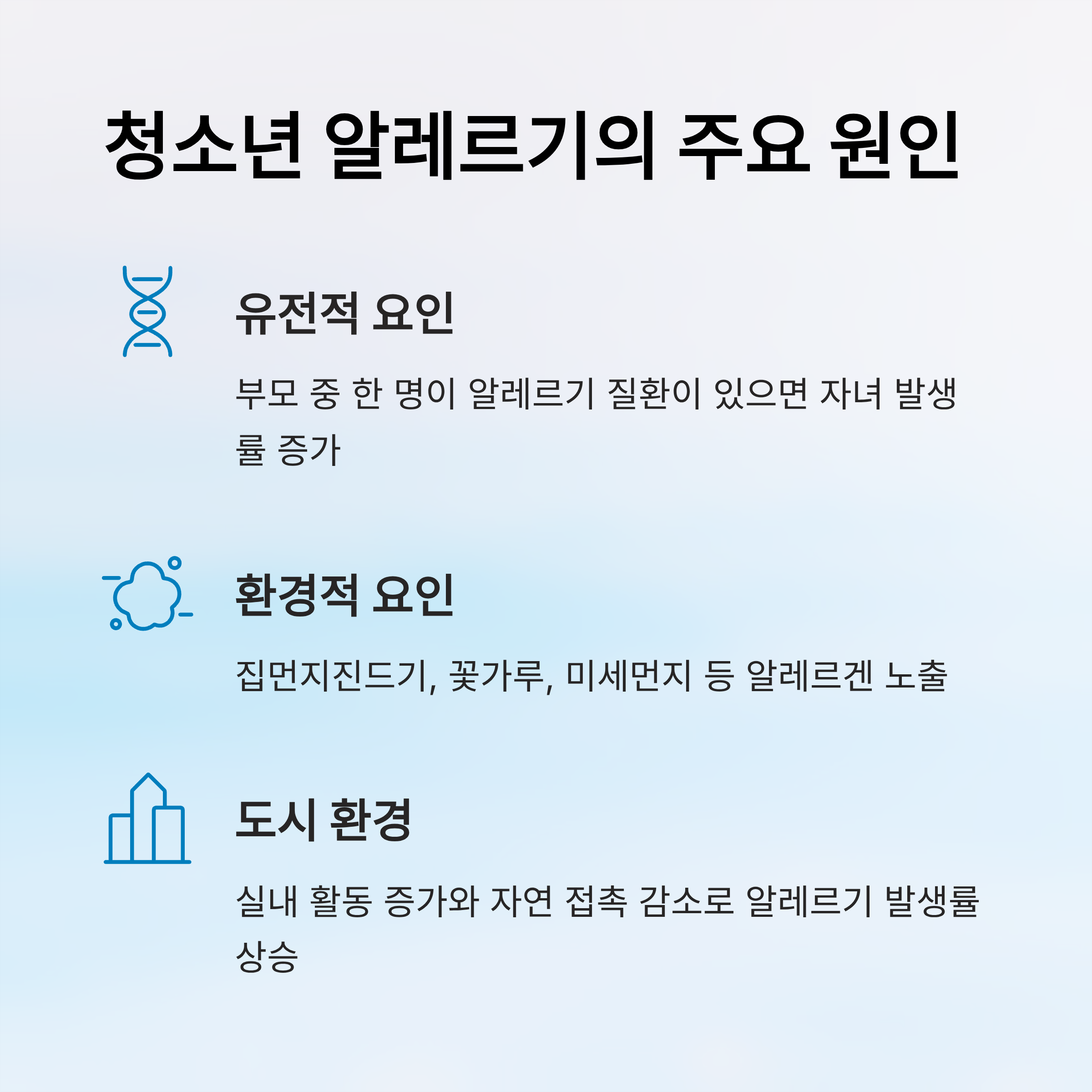 청소년기의 알레르기는 유전적인 요인과 환경적인 요인이 복합적으로 작용해서 생기는 경우가 많아요. 부모 중 한 명이 알레르기 질환이 있다면 자녀에게도 비슷한 증상이 나타날 확률이 높아요. 특히 천식, 비염, 아토피 피부염은 흔히 같이 나타나기도 하죠.