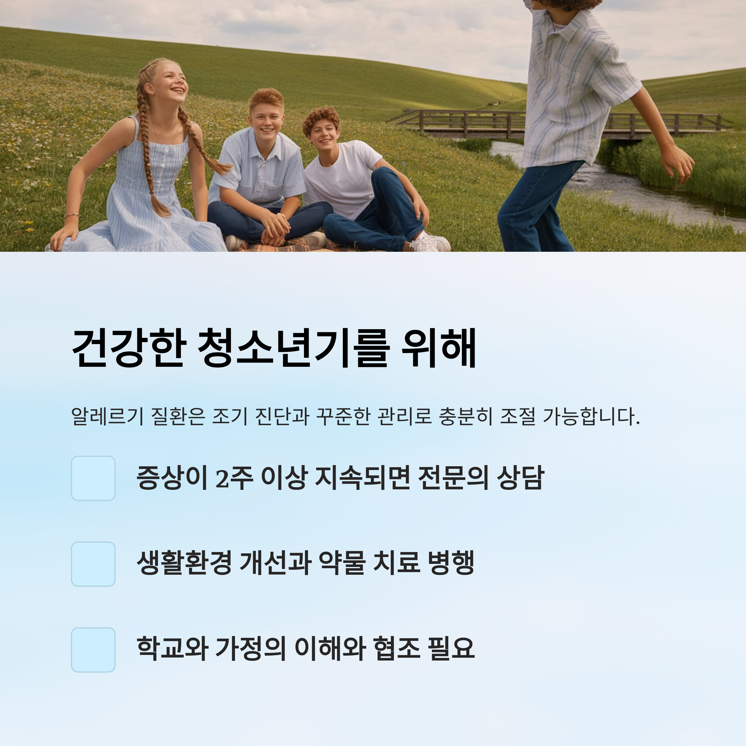 청소년의 면역 체계는 아직 완전히 성숙하지 않아서 외부 자극에 더 민감하게 반응할 수 있어요. 따라서 청소년기에는 알레르기 유발 환경을 최소화하고, 증상이 보일 때 빠르게 병원을 찾아 원인을 찾는 게 정말 중요해요. 🌼
