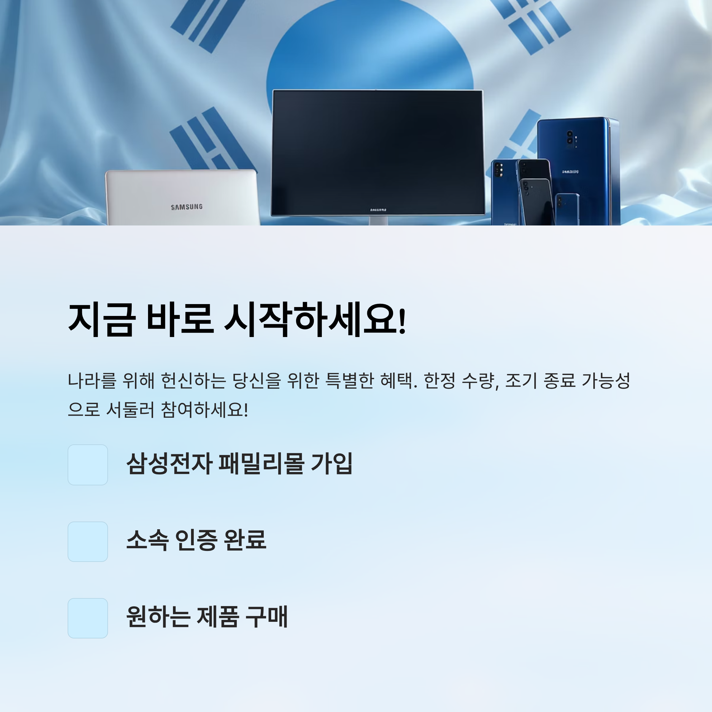 A2. 삼성전자 패밀리몰에서 신분증이나 공무원증 등 증빙자료 업로드로 진행돼요.