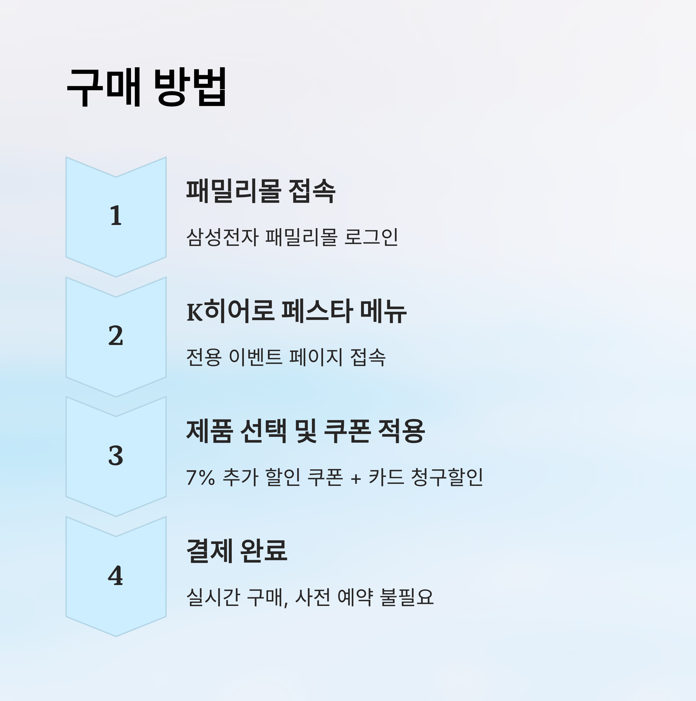 구매 절차는 매우 간단해요. 먼저 삼성전자 패밀리몰 접속 → 회원가입 및 소속 인증 → K히어로 페스타 메뉴 클릭 → 제품 선택 → 쿠폰 및 카드 할인 적용 → 결제 완료 순서로 진행되죠. 복잡한 사전 예약이나 청약 시스템 없이 실시간으로 구매할 수 있어요.