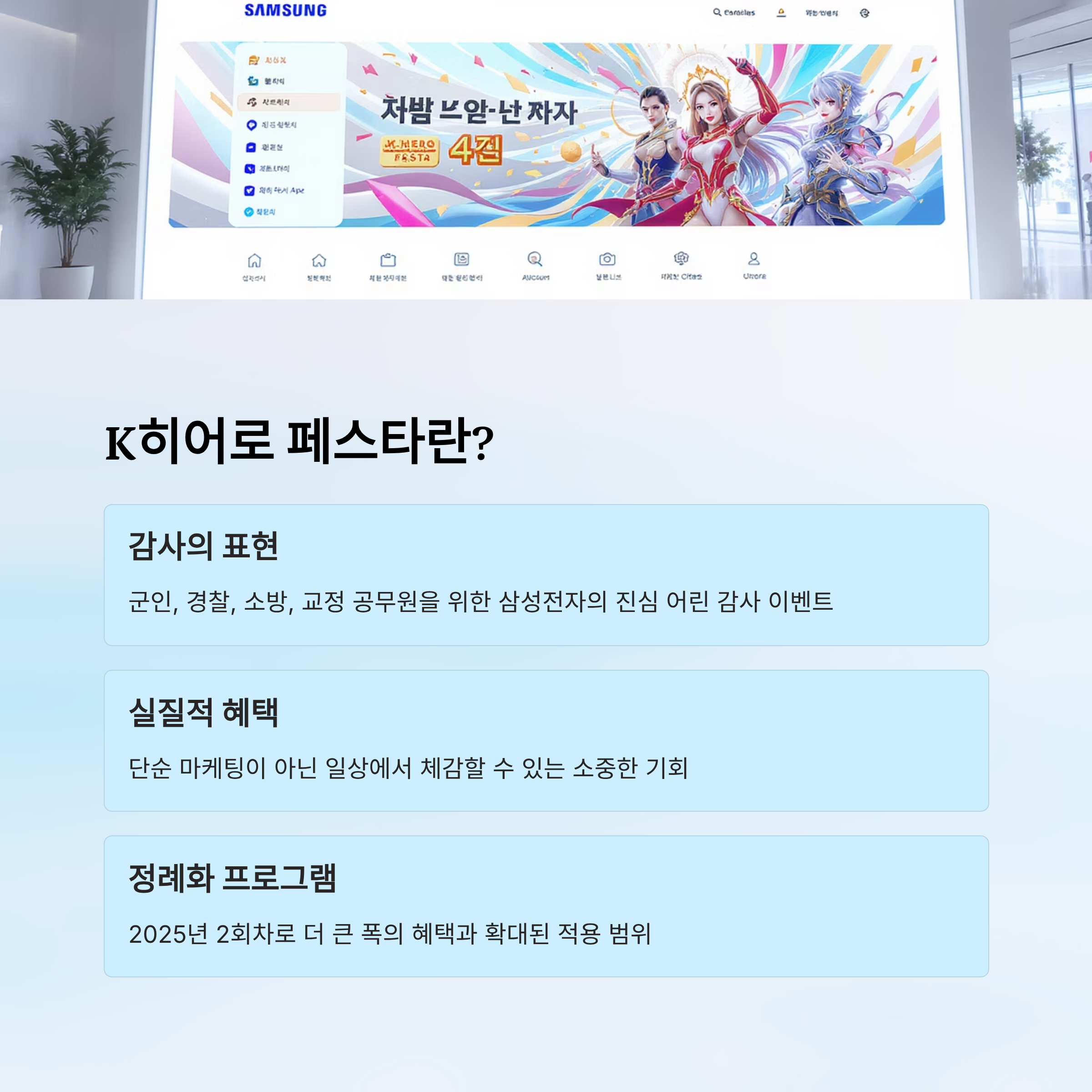 2024년 1회차 행사에 대한 반응이 굉장히 좋았기 때문에, 삼성전자는 이를 정례화하면서 2025년 2회 행사에서는 할인 품목과 혜택 폭을 더욱 확대했어요. 행사명 'K히어로'는 Korean Hero를 의미하며, 대한민국의 안보와 안전을 위해 일하는 모든 분들을 위한 헌사이기도 해요.