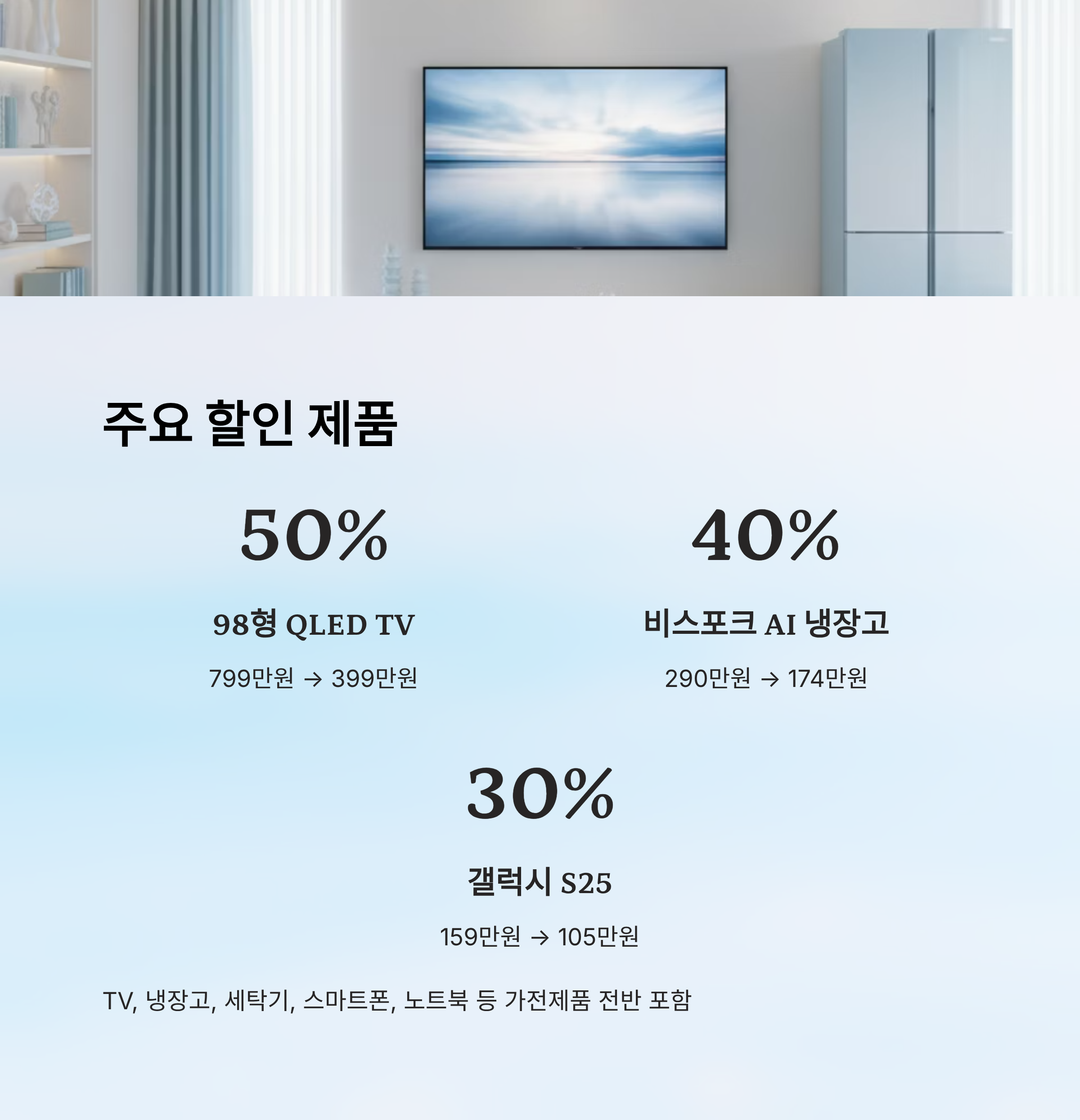 | 98형 QLED 4K TV | 7,990,000원 | 3,990,000원 | 50% 이상 | 초기 품절 가능성 있음 |