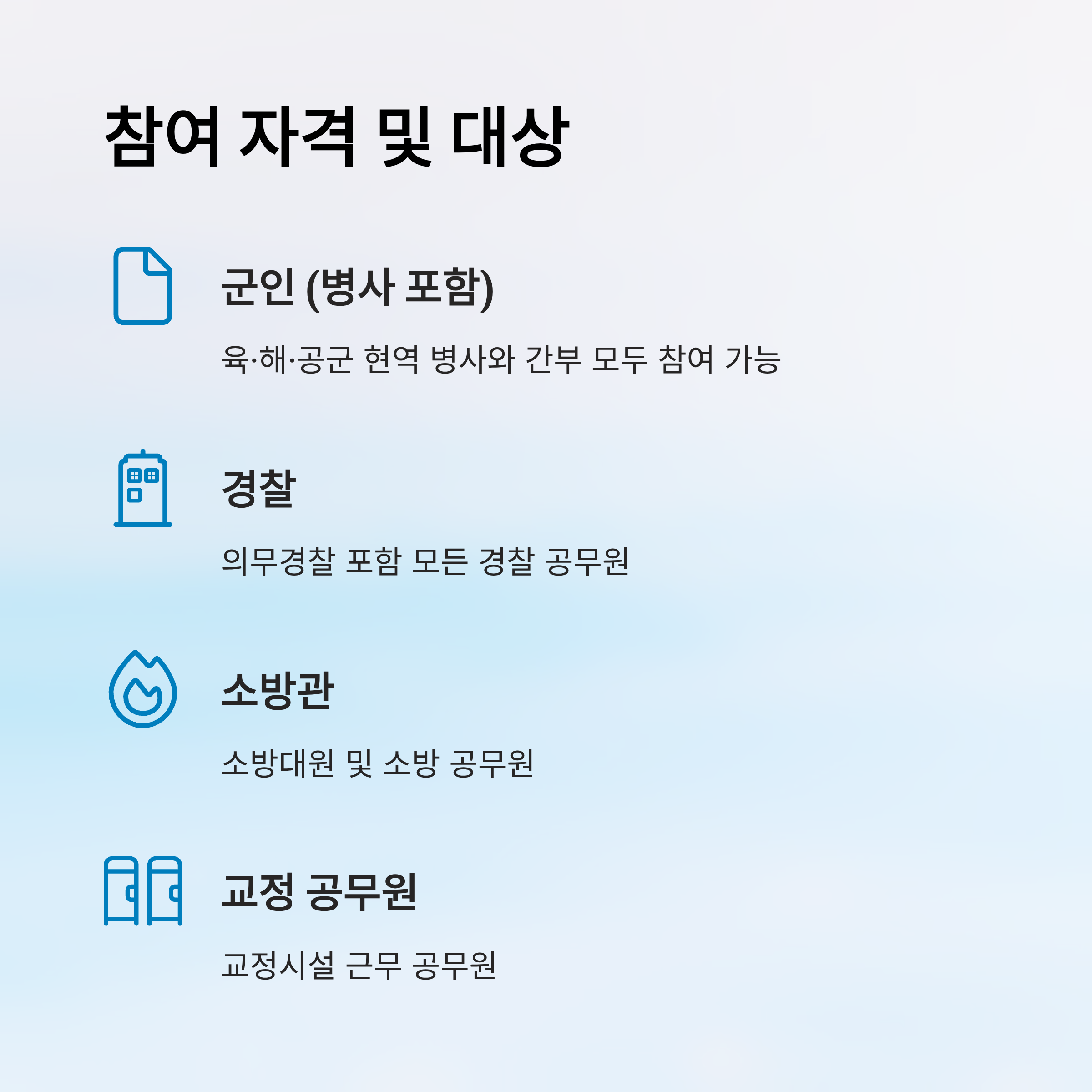 | 참여 대상 | 군인, 경찰, 소방, 교정 공무원 |