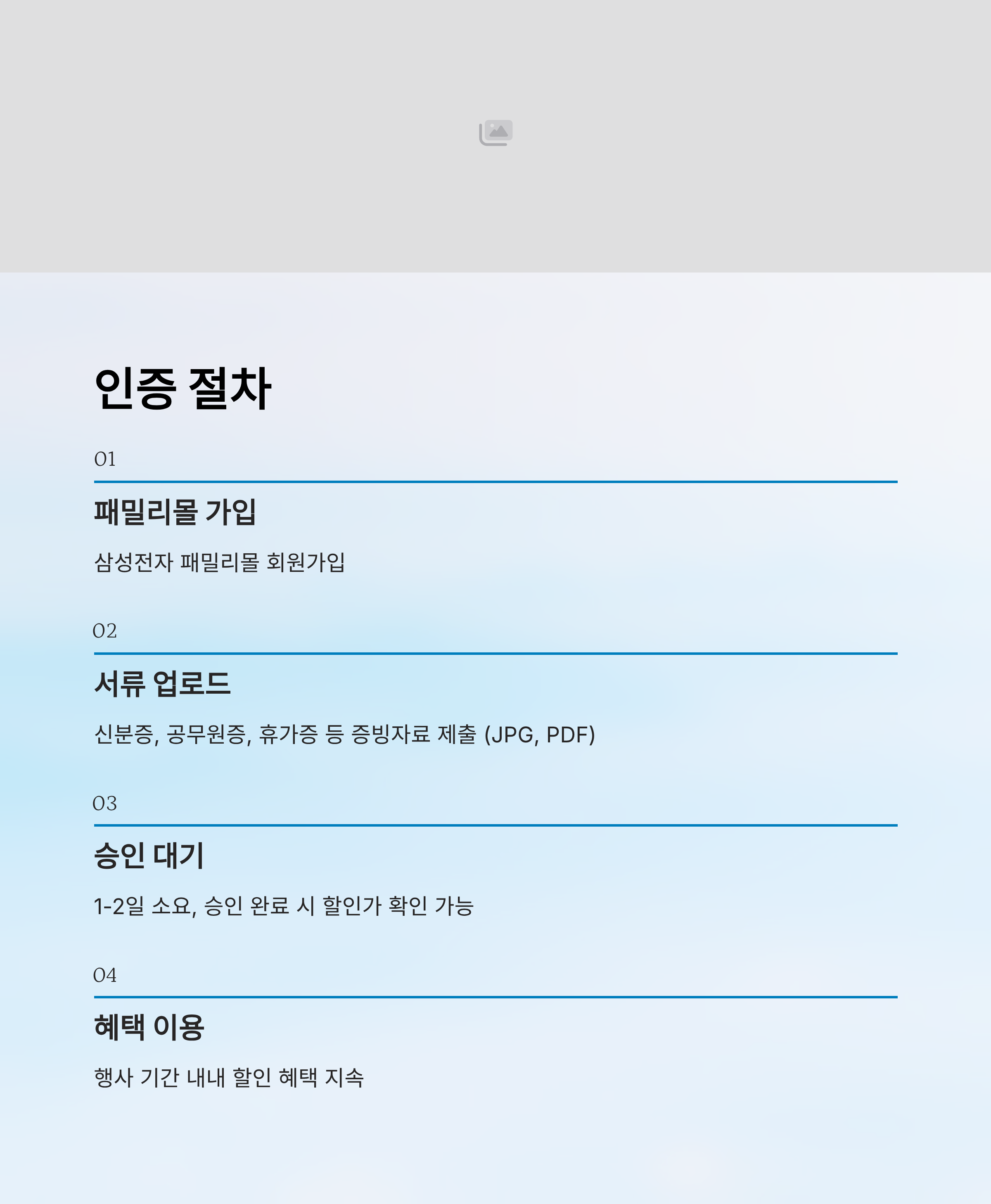 자격 인증은 삼성전자 패밀리몰에 로그인한 후, 이벤트 페이지에서 신분 증빙 서류를 업로드하는 방식으로 진행돼요. 병사일 경우 군인 신분증이나 휴가증 사본을 제출하면 되고, 공무원은 공무원증, 재직증명서 등의 서류가 필요해요. 서류는 JPG, PDF 형식 모두 가능해요.