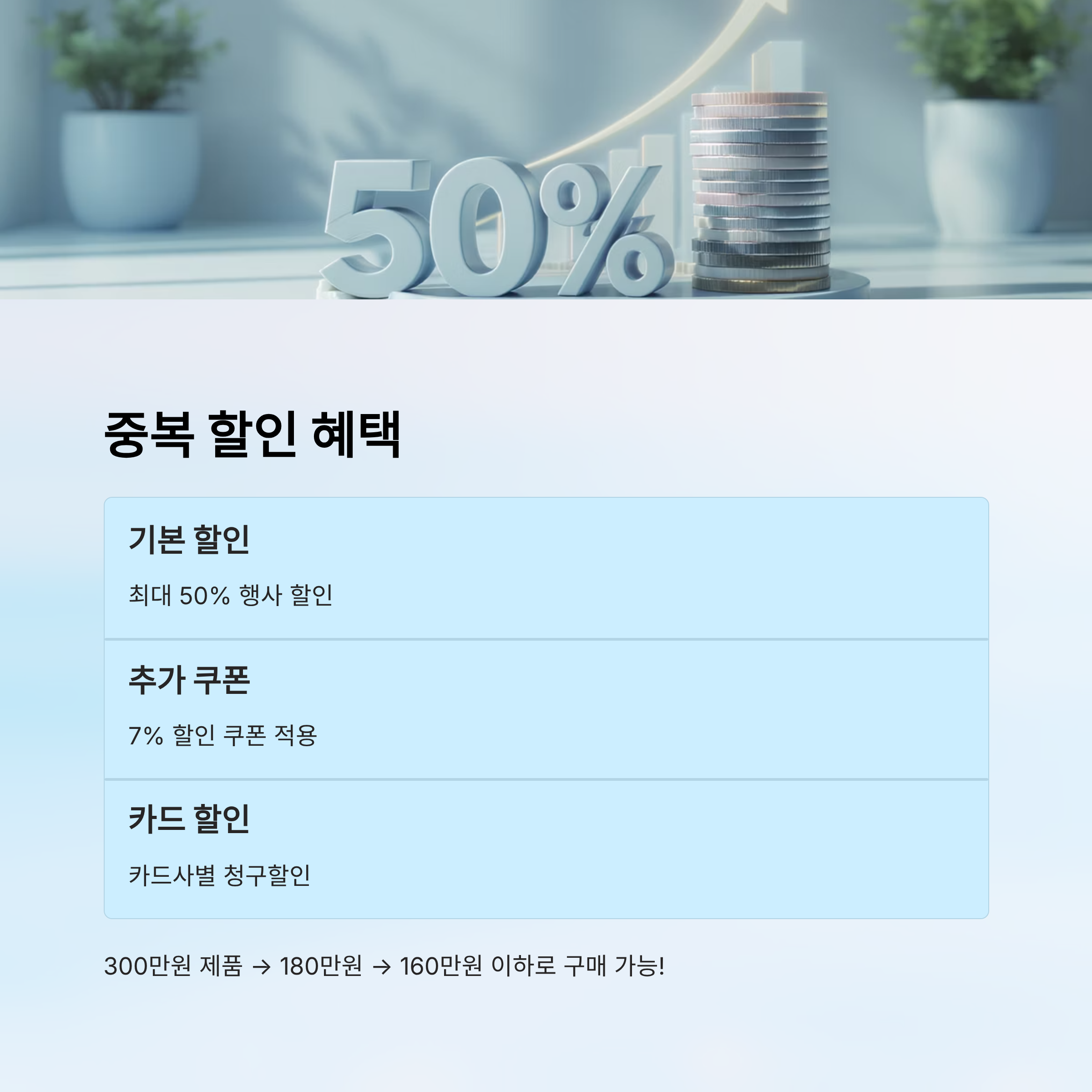 예를 들어, 출고가 300만 원 제품이 행사 할인으로 180만 원이 되고, 거기에 7% 쿠폰과 카드 청구할인이 적용되면 160만 원 이하로 구매가 가능해지는 거죠. 이건 거의 반값 이상 할인인 셈이에요. 깜짝 놀랄 정도의 혜택이에요. 😍