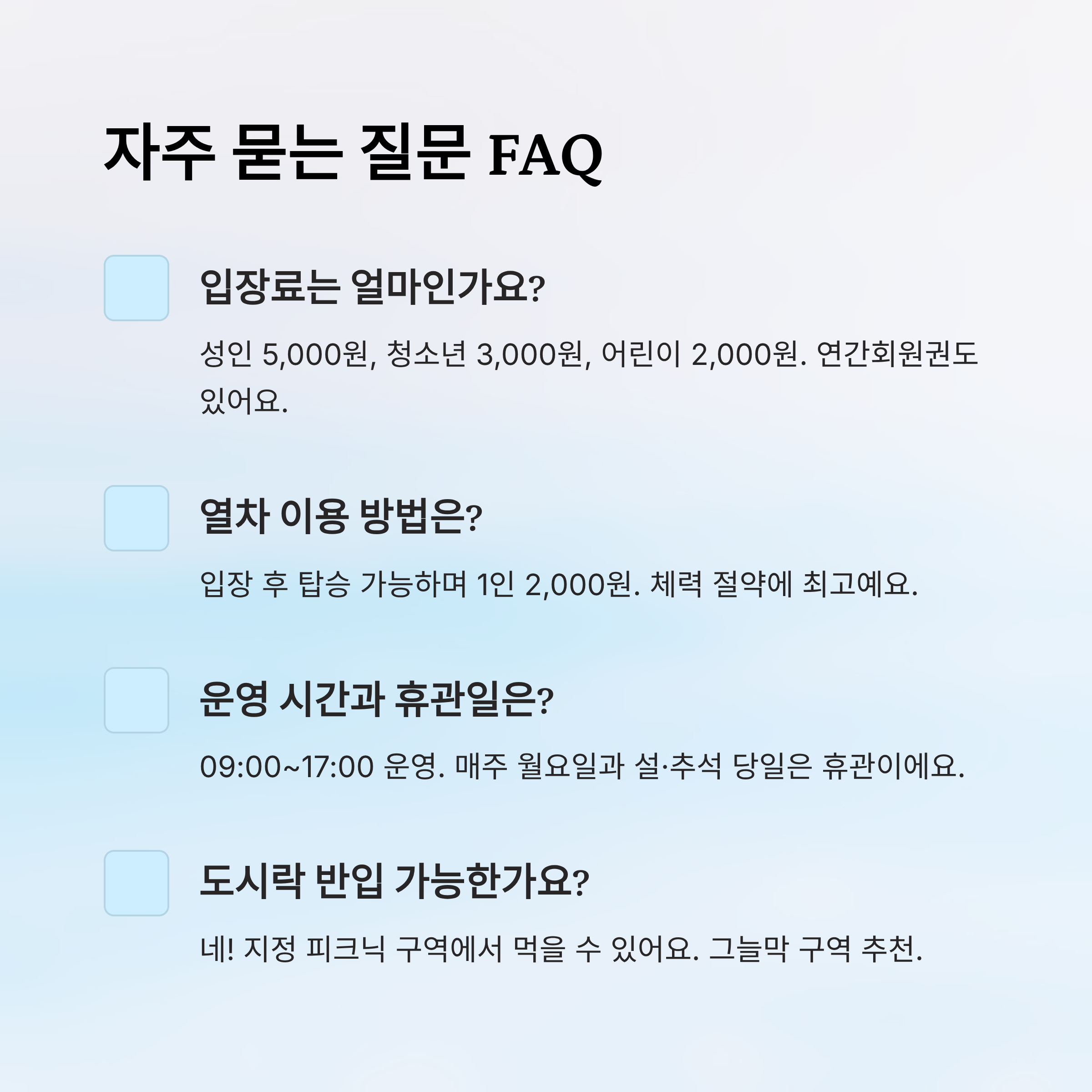 A7. 동물원 열차는 입장 후 탑승 가능하며, 1인 2,000원 정도예요. 체력 절약과 이동 시간을 줄이는 데 좋아요.