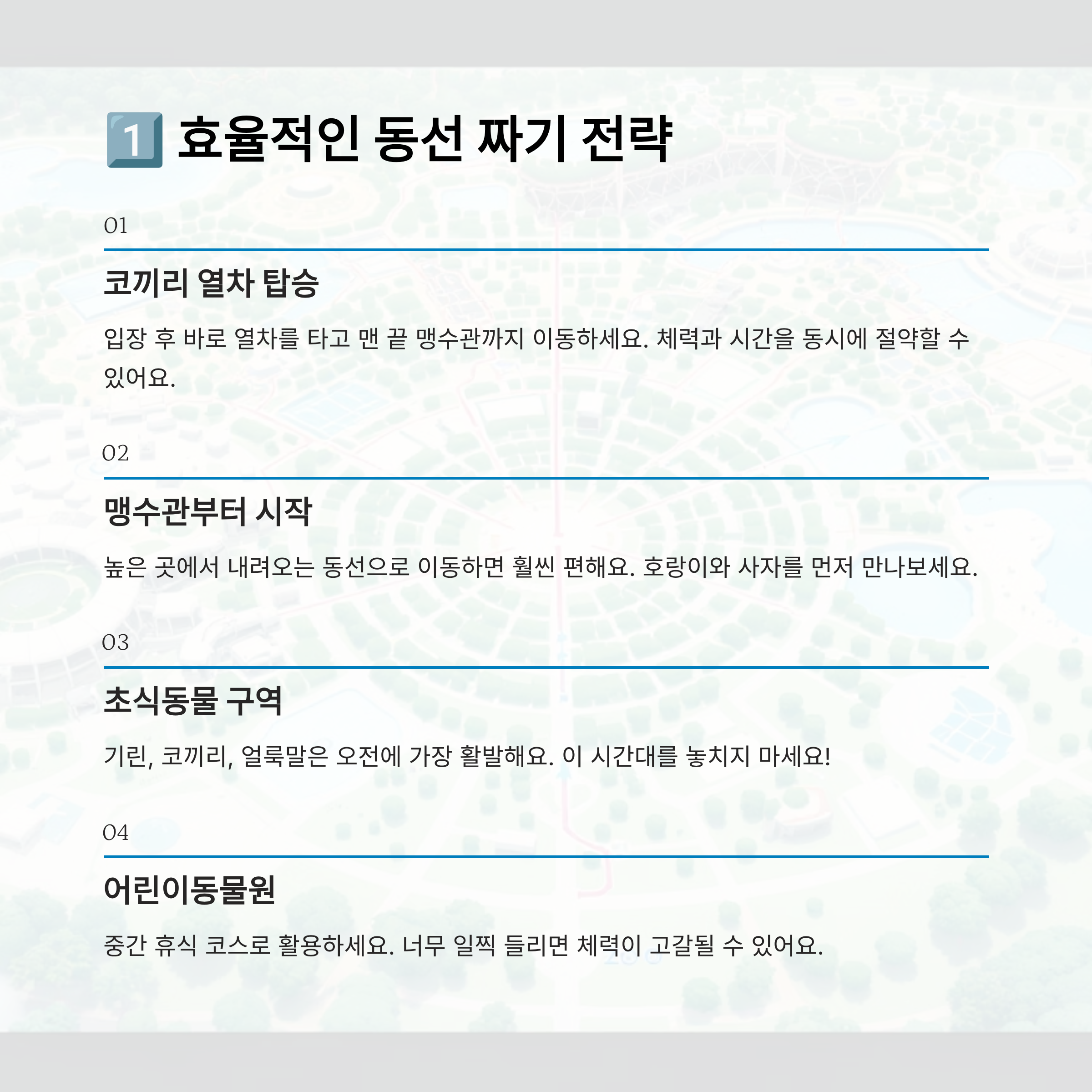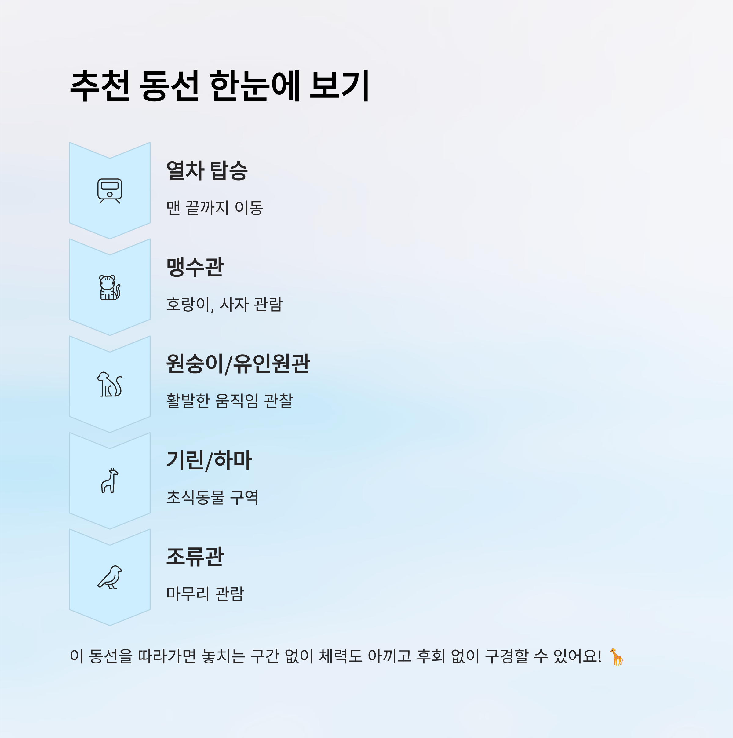 | 열차 탑승 → 맹수관 → 초식관 | 높은 곳부터 내려오는 구조, 체력 절약 | 오전 10시~오후 1시 |
