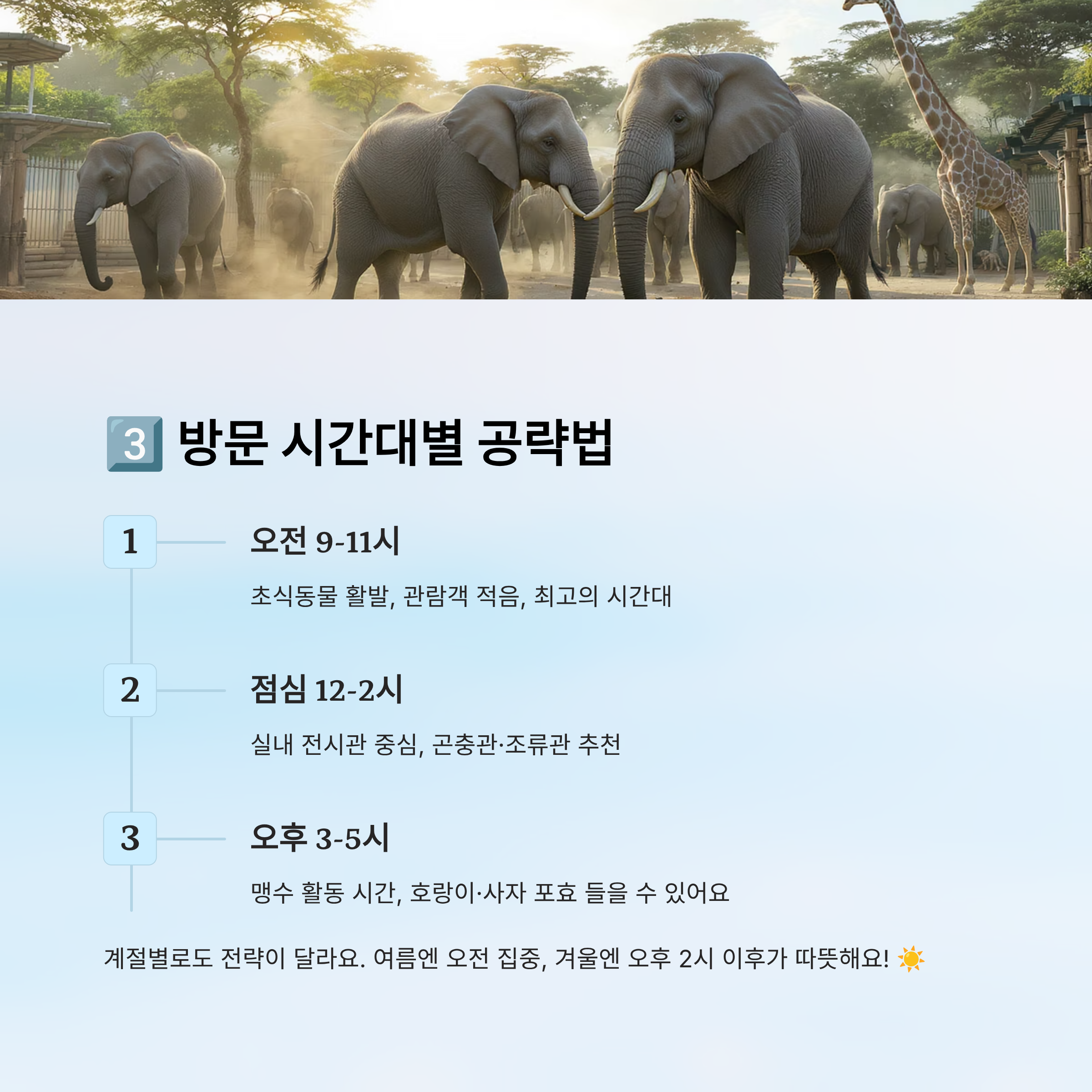 시간대별로 전략을 세우면 같은 장소에서도 훨씬 재미있고, 동물들과 눈도 마주치고 사진도 예쁘게 찍을 수 있어요. 😊