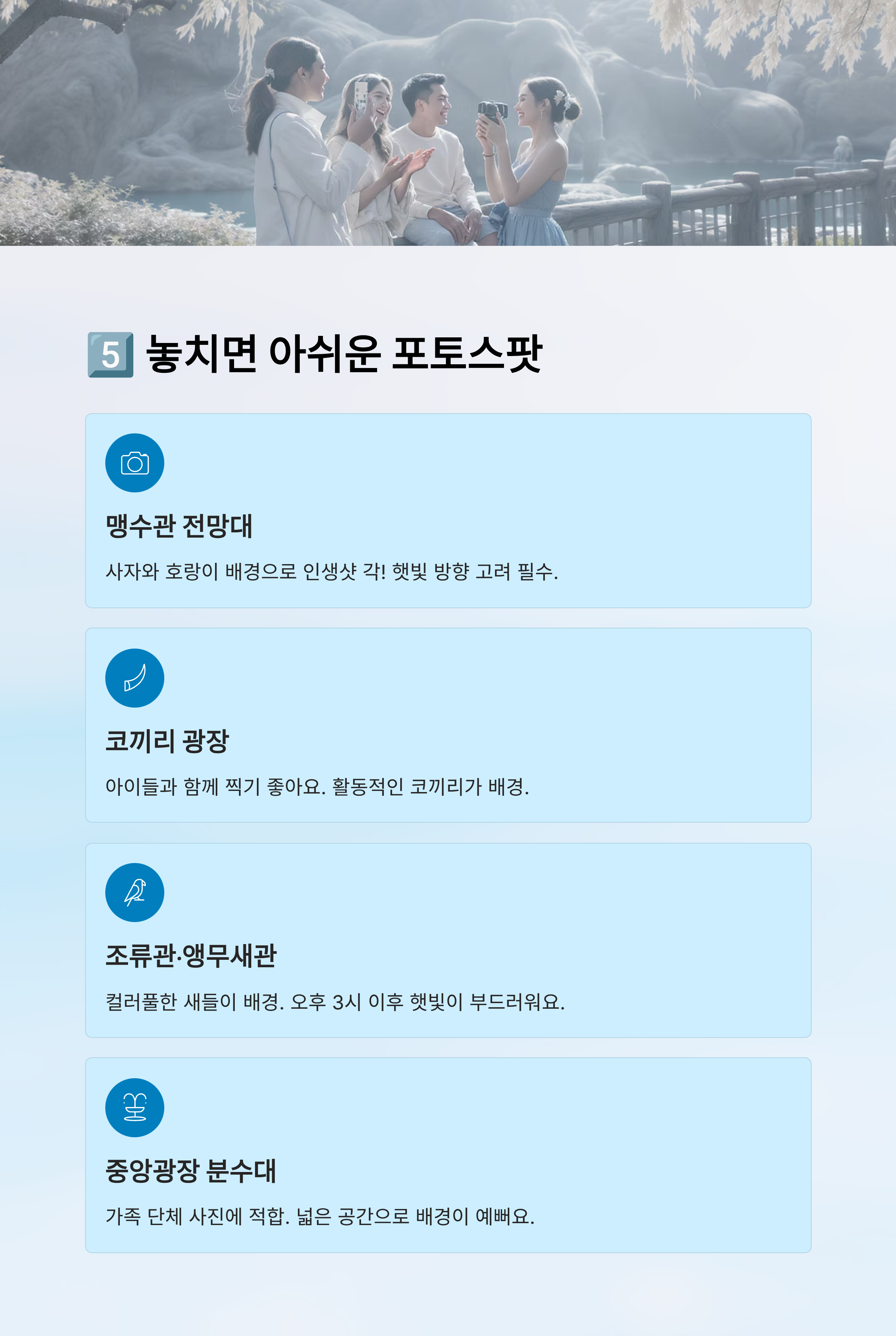 | 맹수관 전망대 | 오전 10시~11시 | 사자, 호랑이 배경 | 햇빛 방향 고려 |