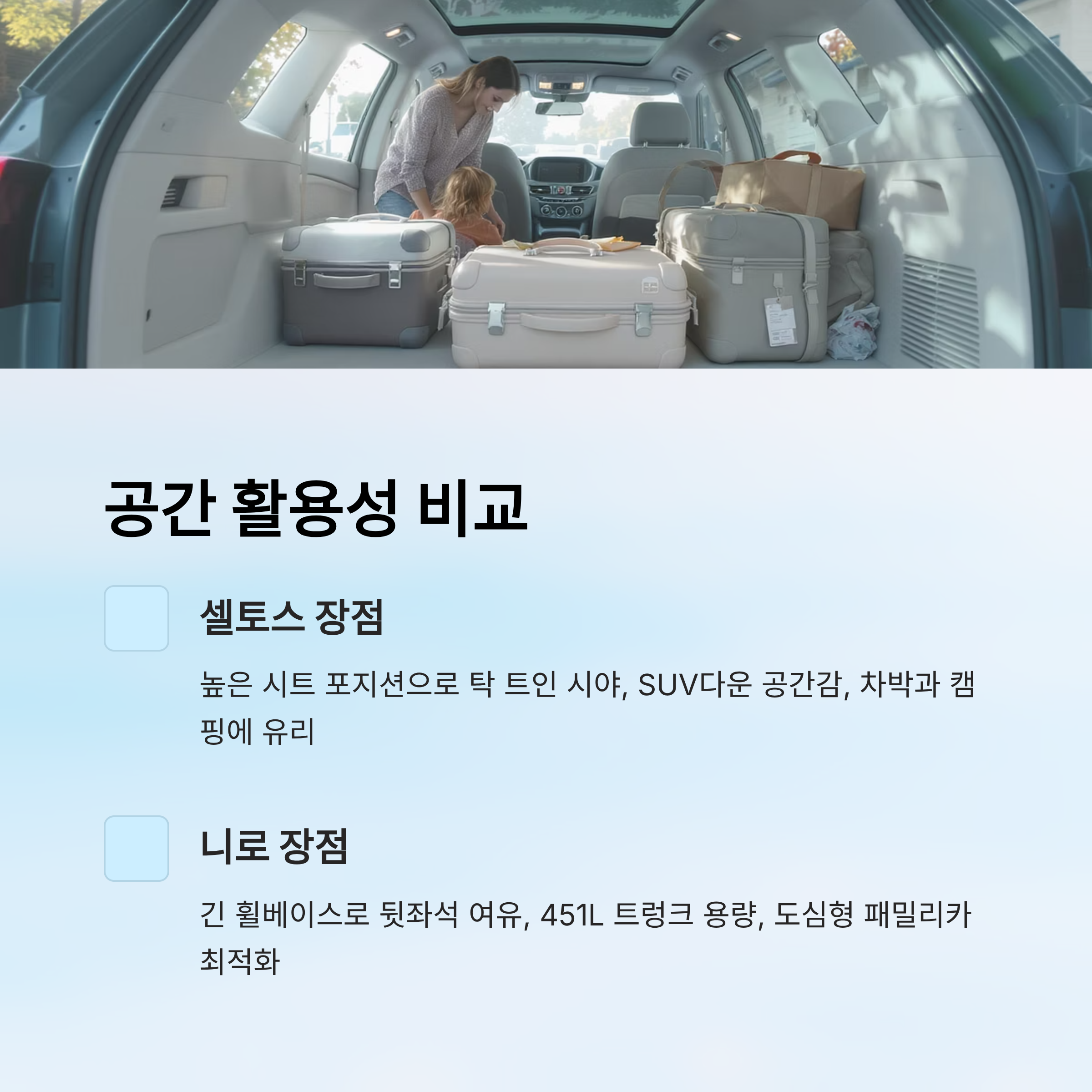 트렁크 용량은 니로가 451L로 공식 수치상 더 넓지만, 셀토스는 트렁크 상단 높이와 하부 수납 공간이 더 실용적으로 설계될 가능성이 커요. 차박이나 캠핑, 자전거 같은 짐을 자주 싣는다면 셀토스 쪽이 더 유리할 수 있죠.