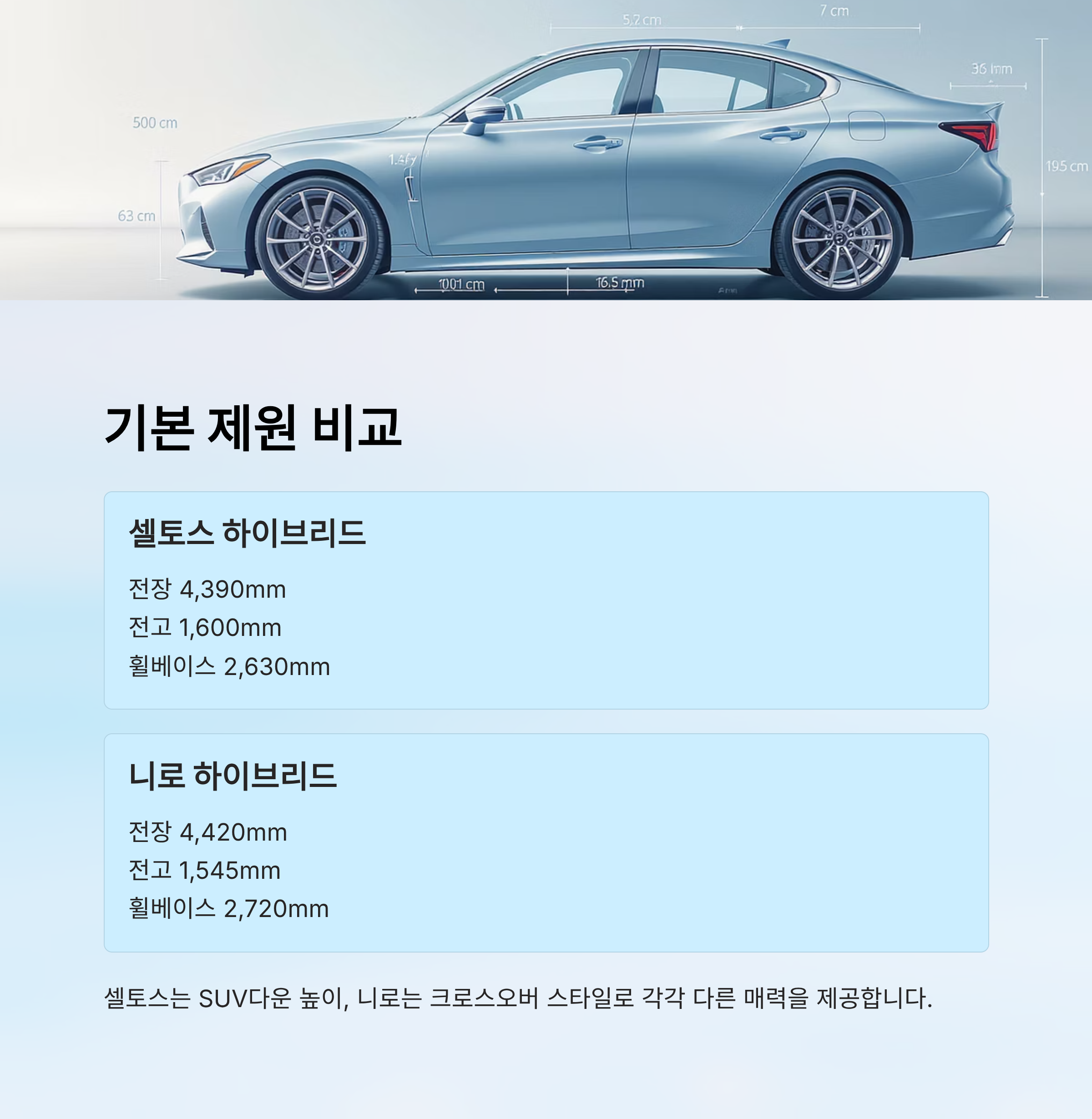 두 모델 모두 현대기아차의 1.6L 가솔린 하이브리드 시스템을 공유하고 있지만, 실내 구성이나 주행 질감, 옵션 구성에서 차이를 보여요. 기본적인 제원만 보면 셀토스가 약간 더 큽니다.
