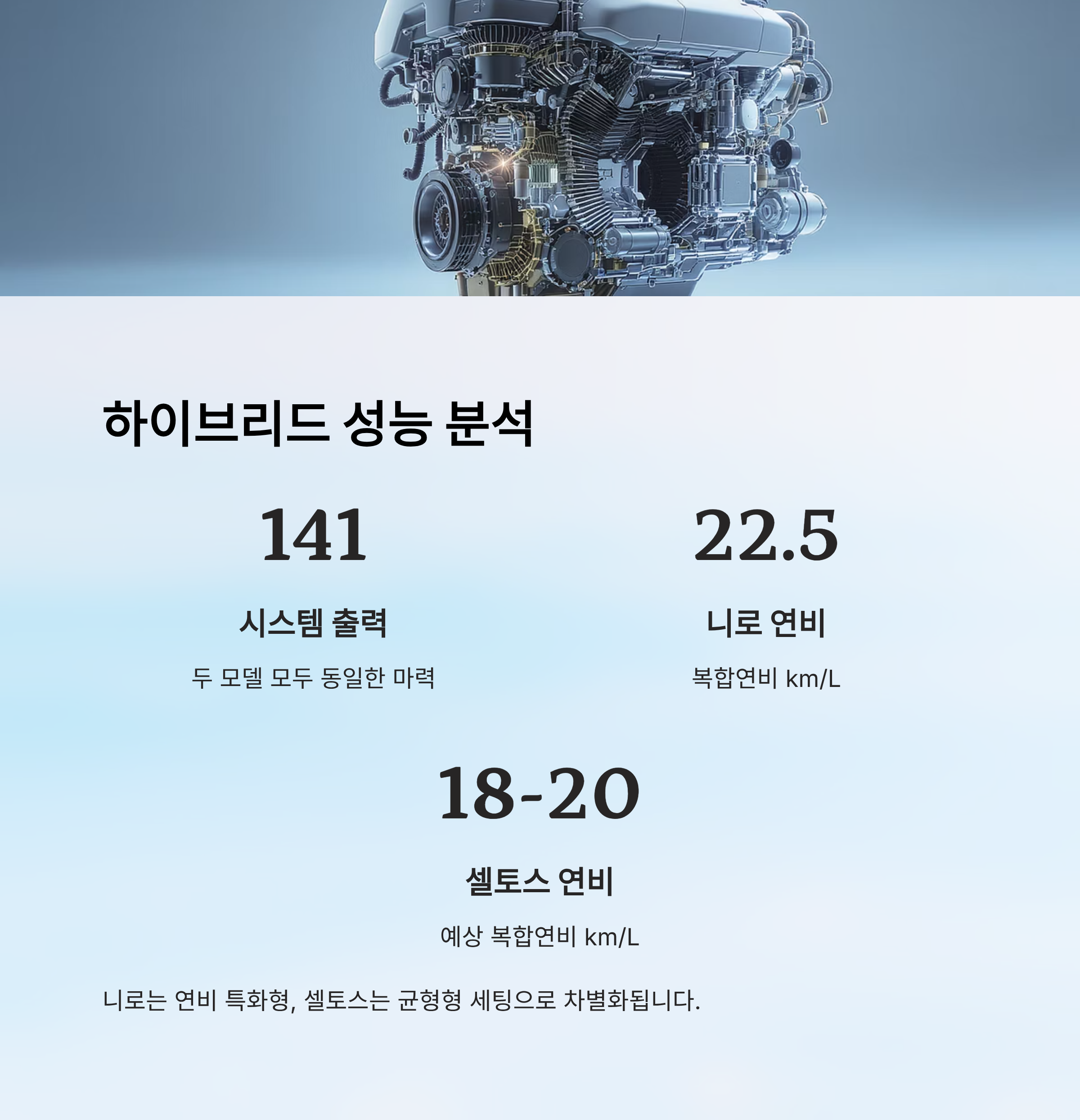 두 모델 모두 같은 하이브리드 시스템(1.6L 가솔린 엔진 + 전기모터)을 사용하지만, 셋업에 따라 주행감이나 연비에서 차이가 생겨요. 특히 니로는 '연비 특화형'이고, 셀토스는 '균형형'이라 할 수 있어요.