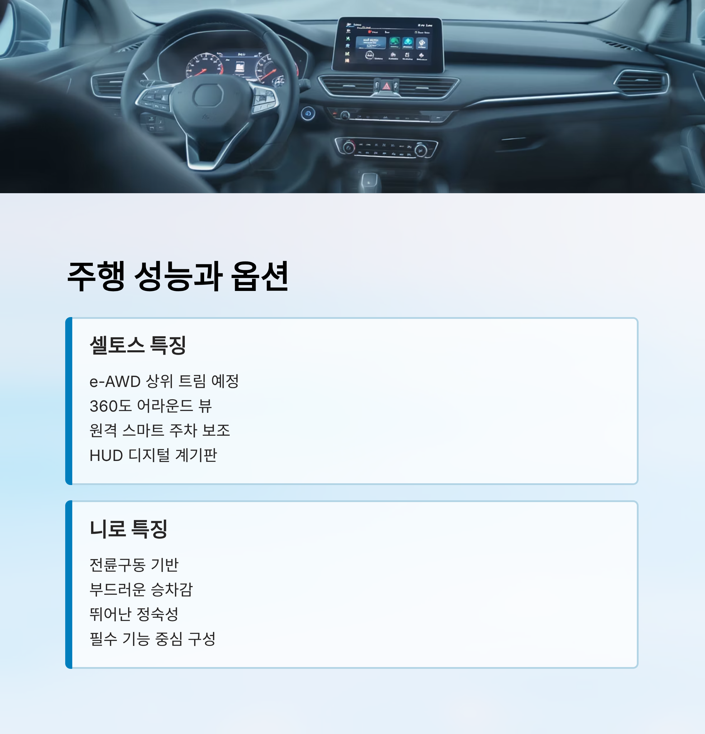 외관뿐 아니라 실내 구성에서도 차이가 나타나요. 셀토스는 대형 듀얼 디스플레이와 전자식 칼럼 기어, 최신 인포테인먼트 시스템이 탑재될 예정이에요. 니로는 실용적인 구성에 충실하지만, 실내 마감은 비교적 간결한 편이에요.