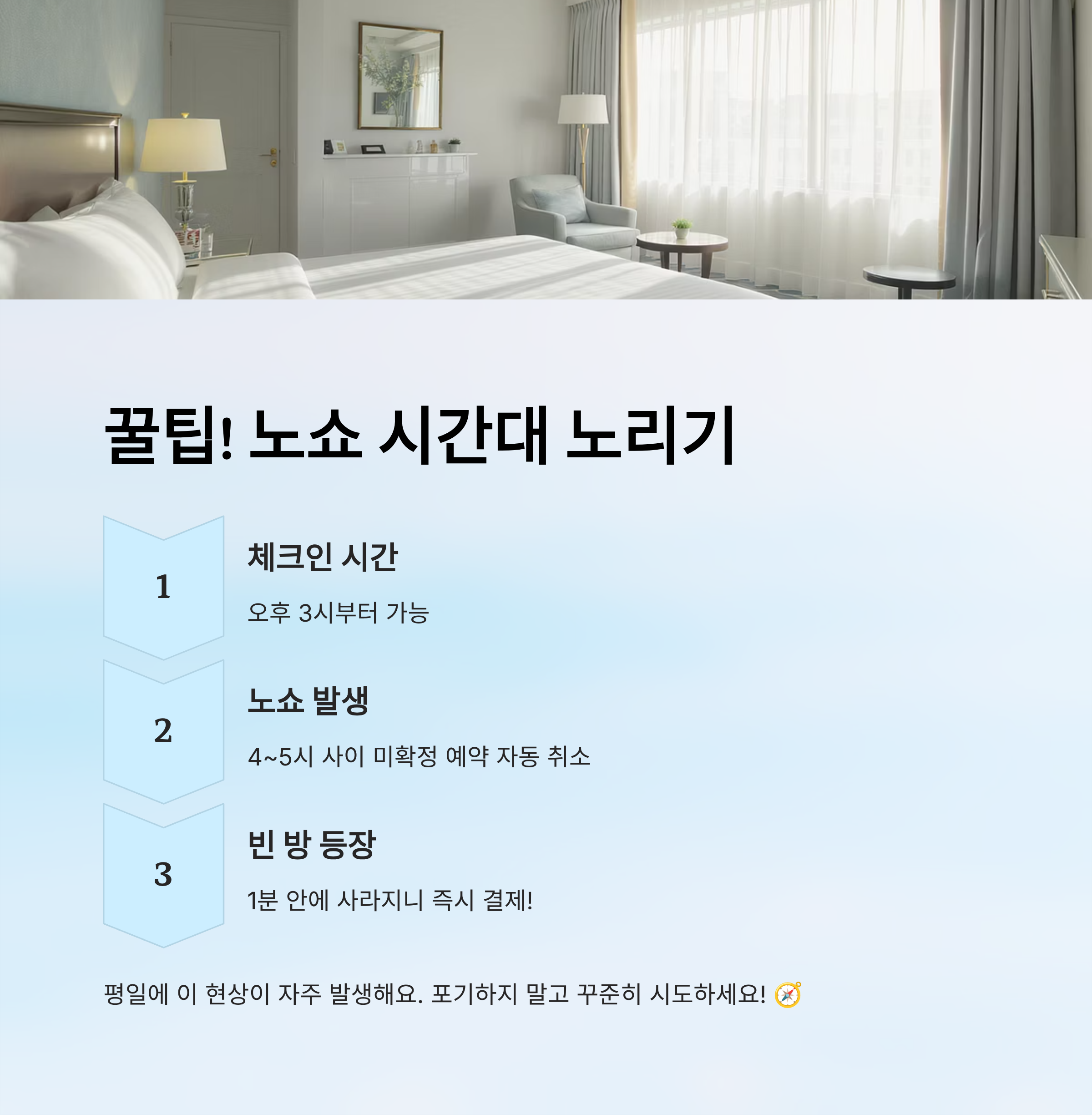노쇼는 매일 일어나는 건 아니지만, 발생할 경우 ‘진짜 찬스’가 되기 때문에 포기하지 말고 꾸준히 시도해보는 걸 추천해요. 놓치지 말고 그 기회를 캐치하세요! 🧭
