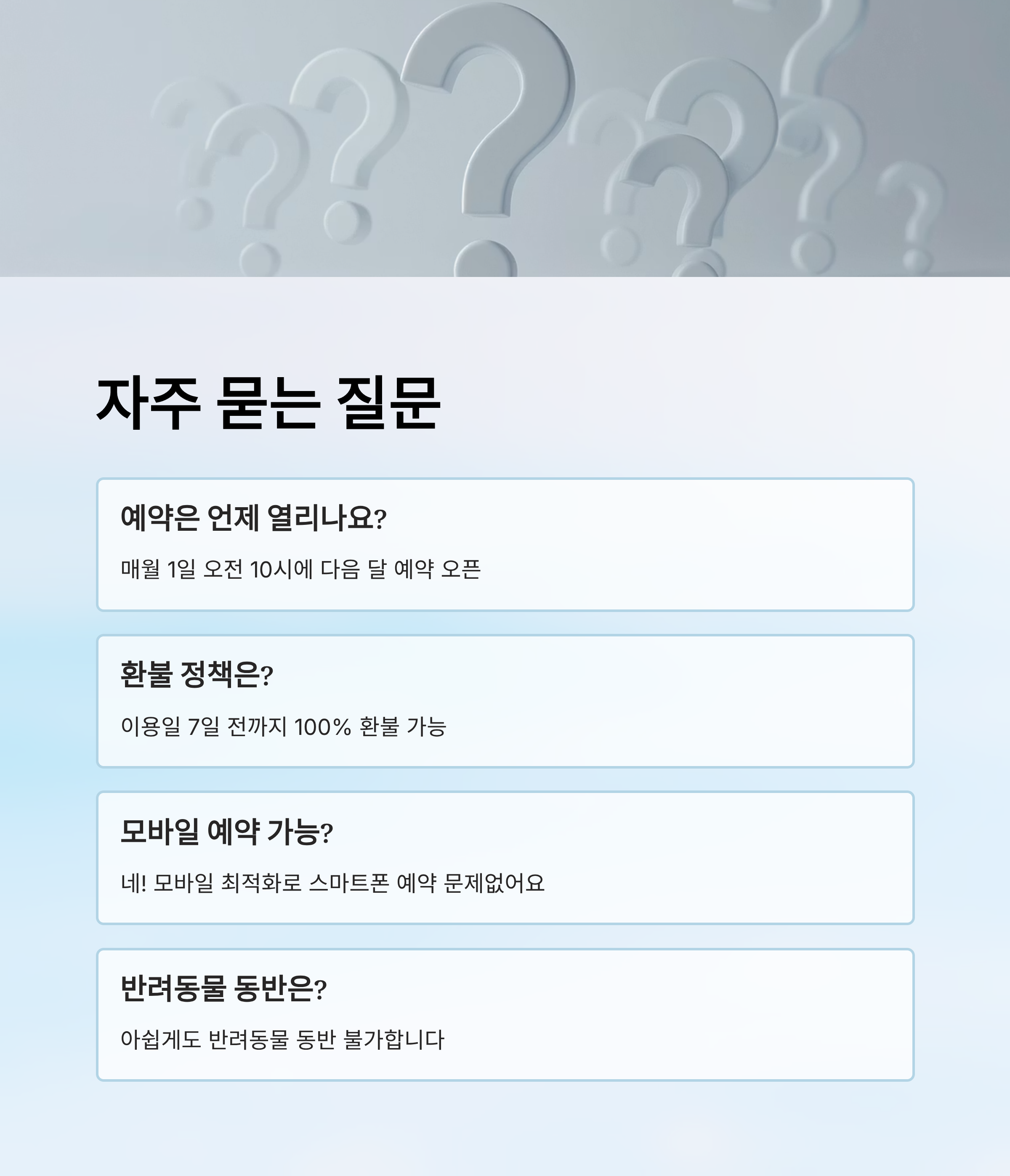 A4. 이용일 기준 7일 전까지는 100% 환불 가능하고, 그 이후는 차감되거나 환불이 제한돼요. 자세한 내용은 예약 페이지 참고!