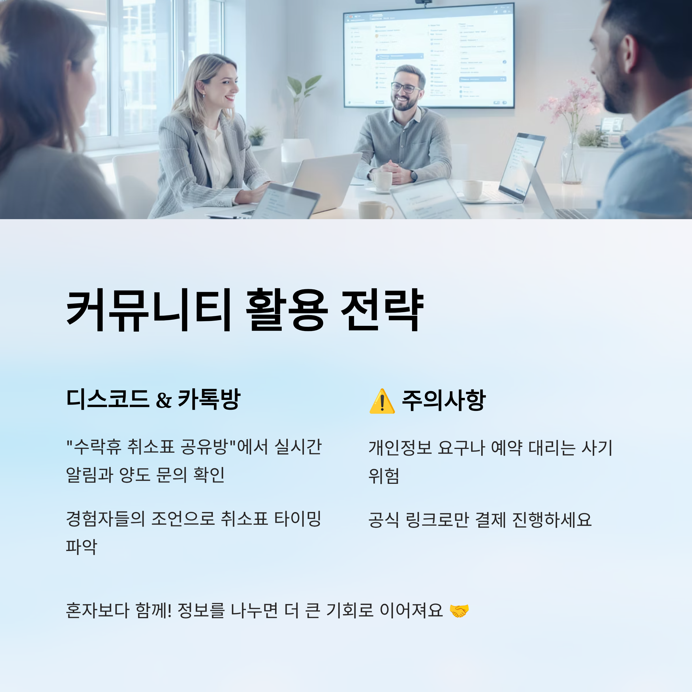 주의할 점은 개인정보 요구나 예약 대리 등의 사기성 거래는 반드시 피해야 해요. 꼭 공식적인 예약 링크를 통해서만 결제나 예약을 진행해야 해요. 커뮤니티는 정보 공유의 용도로만 활용하는 게 안전해요.
