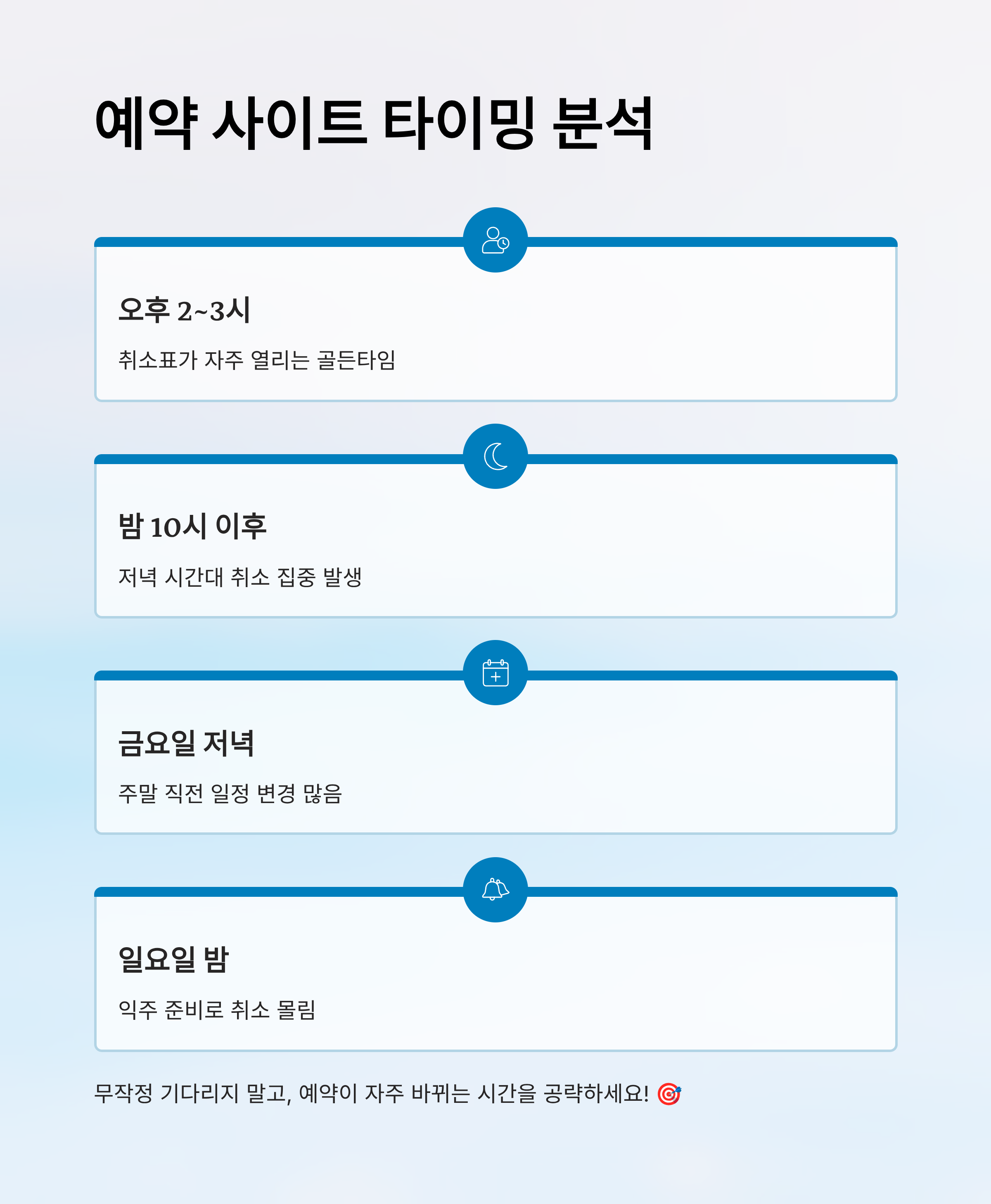 또한 금요일 저녁, 일요일 밤은 취소가 몰리는 시간대 중 하나예요. 주말 직전에 일정 변경이 많기 때문이죠. 이 시간대를 집중적으로 노려보면 확률이 확 올라가요. 하루 2~3번만 집중해서 확인해도 기회를 잡을 수 있어요.