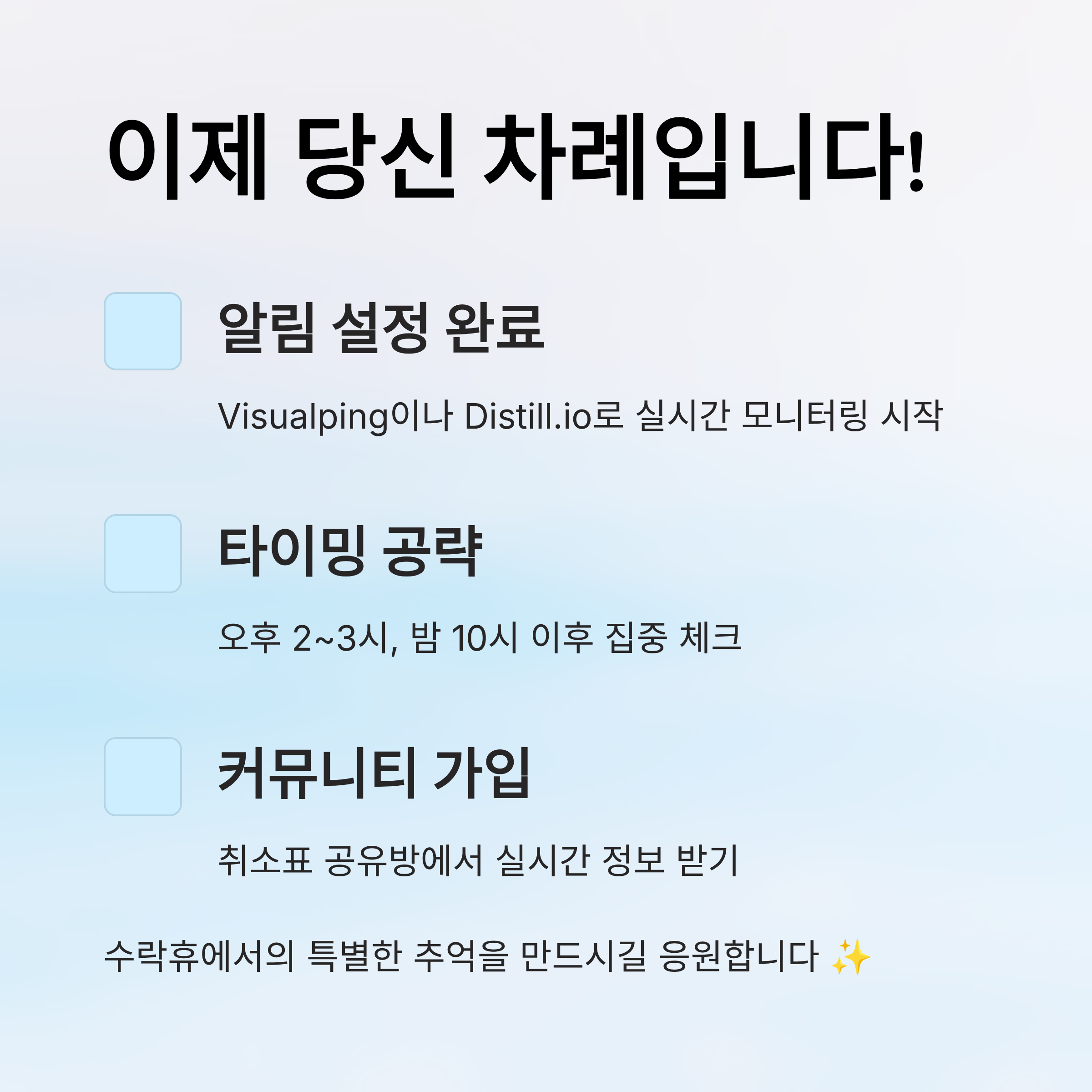 이 방법은 시간 투자는 적지만 알림 세팅만 잘 해두면 확률을 크게 높일 수 있는 전략이라 누구에게나 추천하고 싶어요. 놓치지 말고 꼭 설정해두세요! 📢