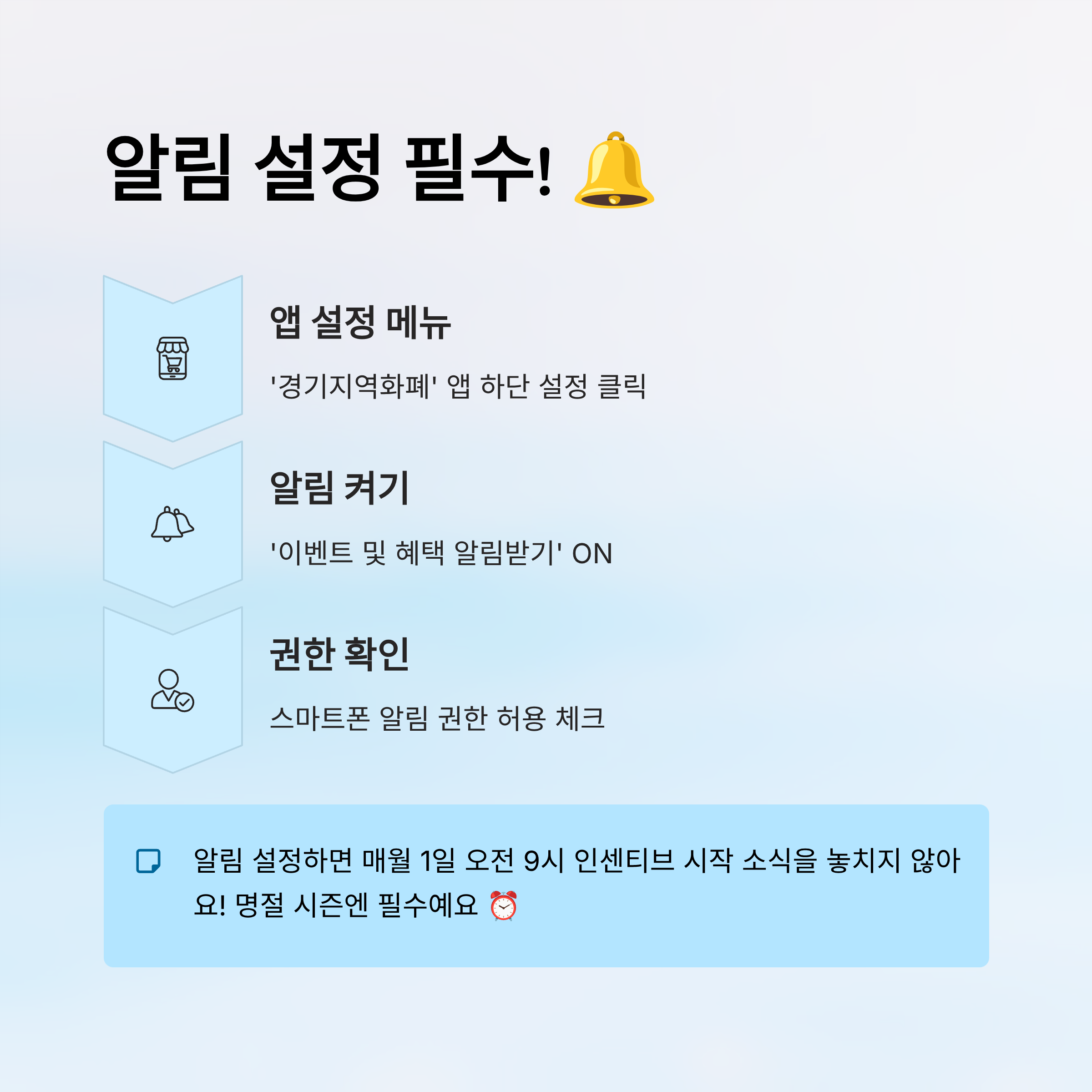 수원페이 인센티브, 매월 1일 오전 9시부터 시작되지만 잊고 지나치면 놓치기 쉬워요. 그래서 가장 확실한 방법은 ‘알림 설정’을 해두는 거예요! 앱 푸시 알림을 켜놓으면 인센티브 지급일과 예산 소진 소식까지 실시간으로 받아볼 수 있답니다.📲