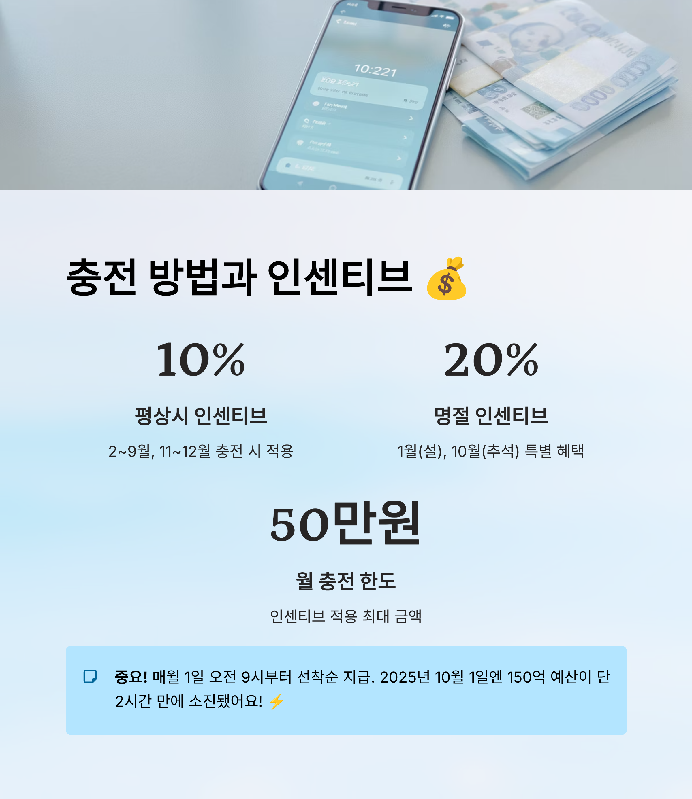 예산은 정해져 있고, 선착순이기 때문에 인기 많은 명절 시즌엔 오전 9시에 바로 충전하지 않으면 혜택을 놓치기 쉬워요. 실제로 2025년 10월 1일, 추석 인센티브 지급날에는 단 2시간 만에 150억 원이 전부 소진됐어요! 😱