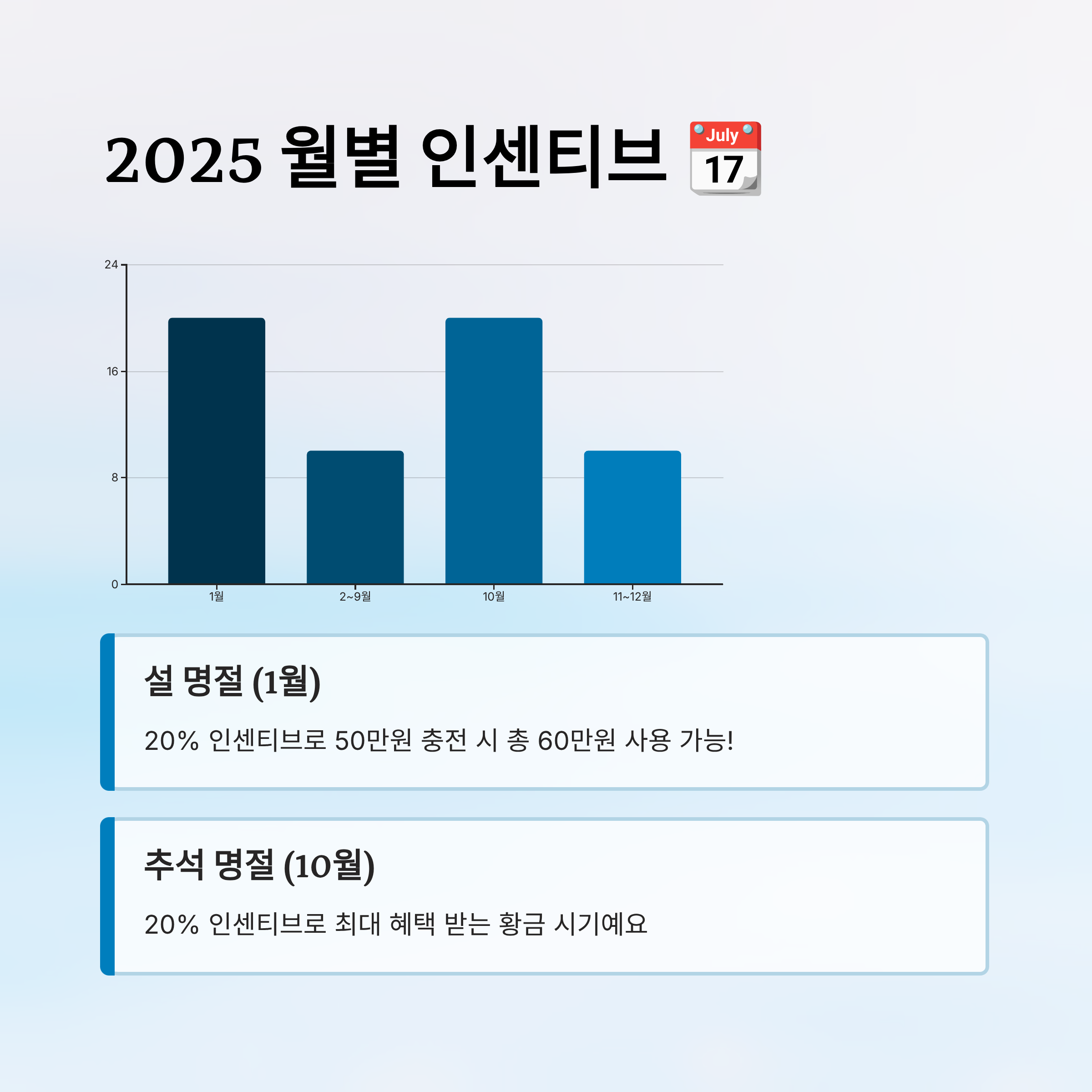 하지만 설 명절이 있는 1월과 추석 명절이 포함된 10월에는 인센티브 비율이 20%로 상향돼요. 즉, 50만 원을 충전하면 10만 원을 인센티브로 받을 수 있으니, 총 60만 원을 쓸 수 있게 되는 셈이에요. 🎉