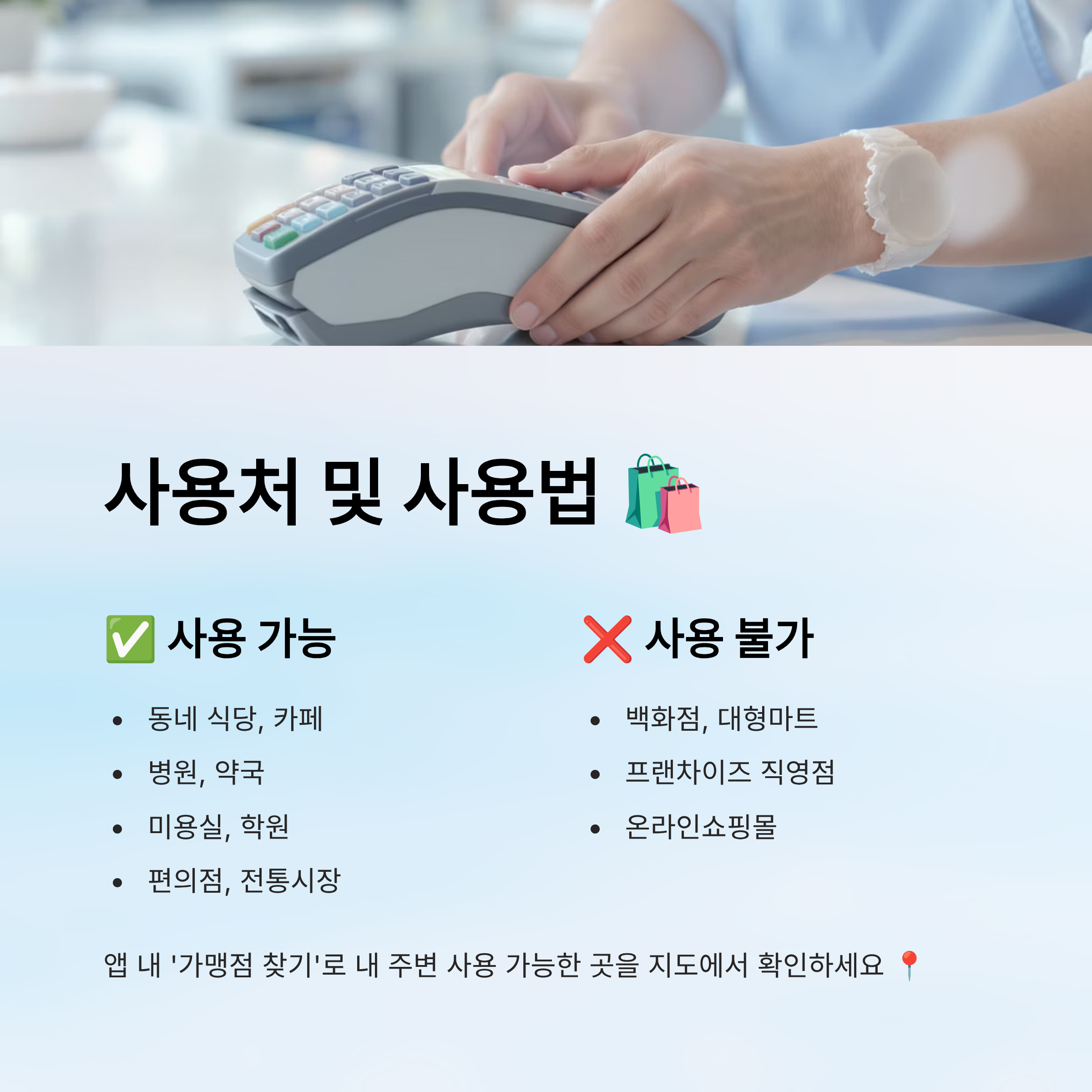 | 식당, 카페, 병원, 약국, 미용실, 전통시장, 학원, 편의점 등 | 백화점, 대형마트, 대기업 프랜차이즈 직영점, 온라인쇼핑몰 등 |
