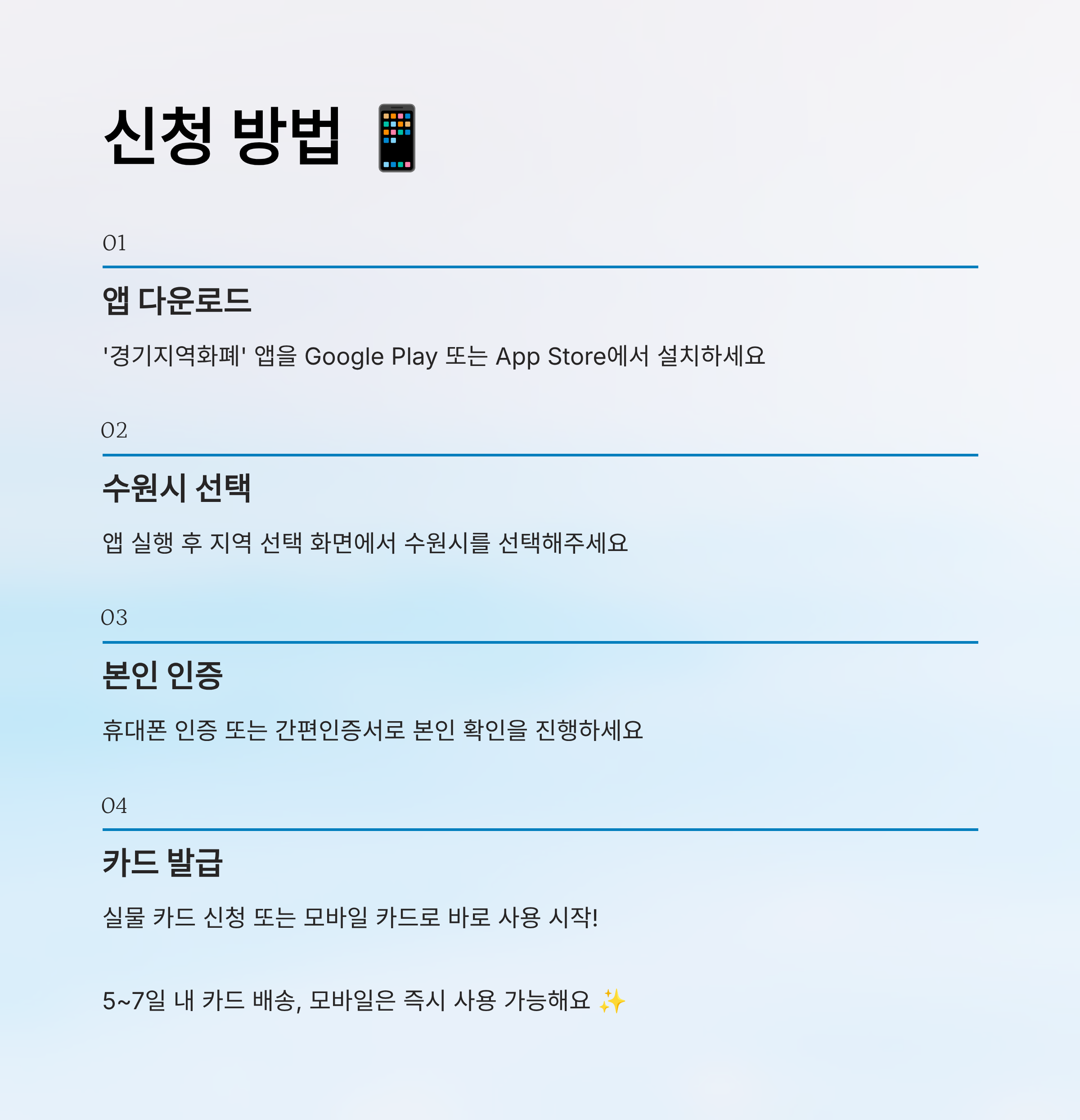 가장 많이 쓰이는 방법은 모바일 앱이에요. 스마트폰에 '경기지역화폐' 앱을 설치하고, 실행 후 '수원시'를 선택하면 수원페이 신청 화면으로 자동 이동돼요. 본인 인증을 완료하면 카드 발급과 충전까지 바로 가능해요.