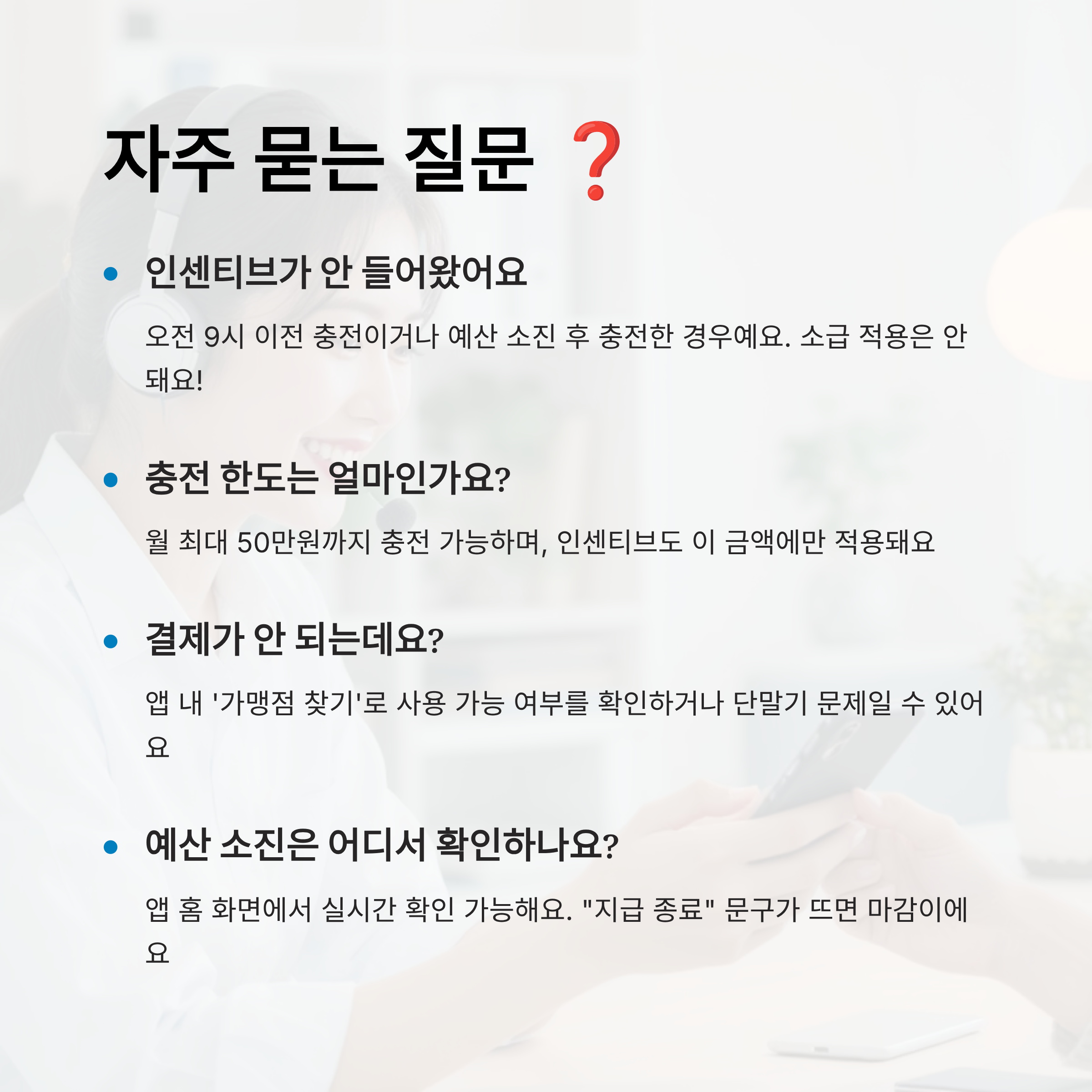 A4. 카드 결제 오류는 단말기 문제이거나, 해당 매장이 가맹 해지된 경우일 수 있어요. 앱 내 '가맹점 찾기'에서 실시간으로 확인하거나 다른 결제 수단을 함께 준비하는 것도 좋아요.