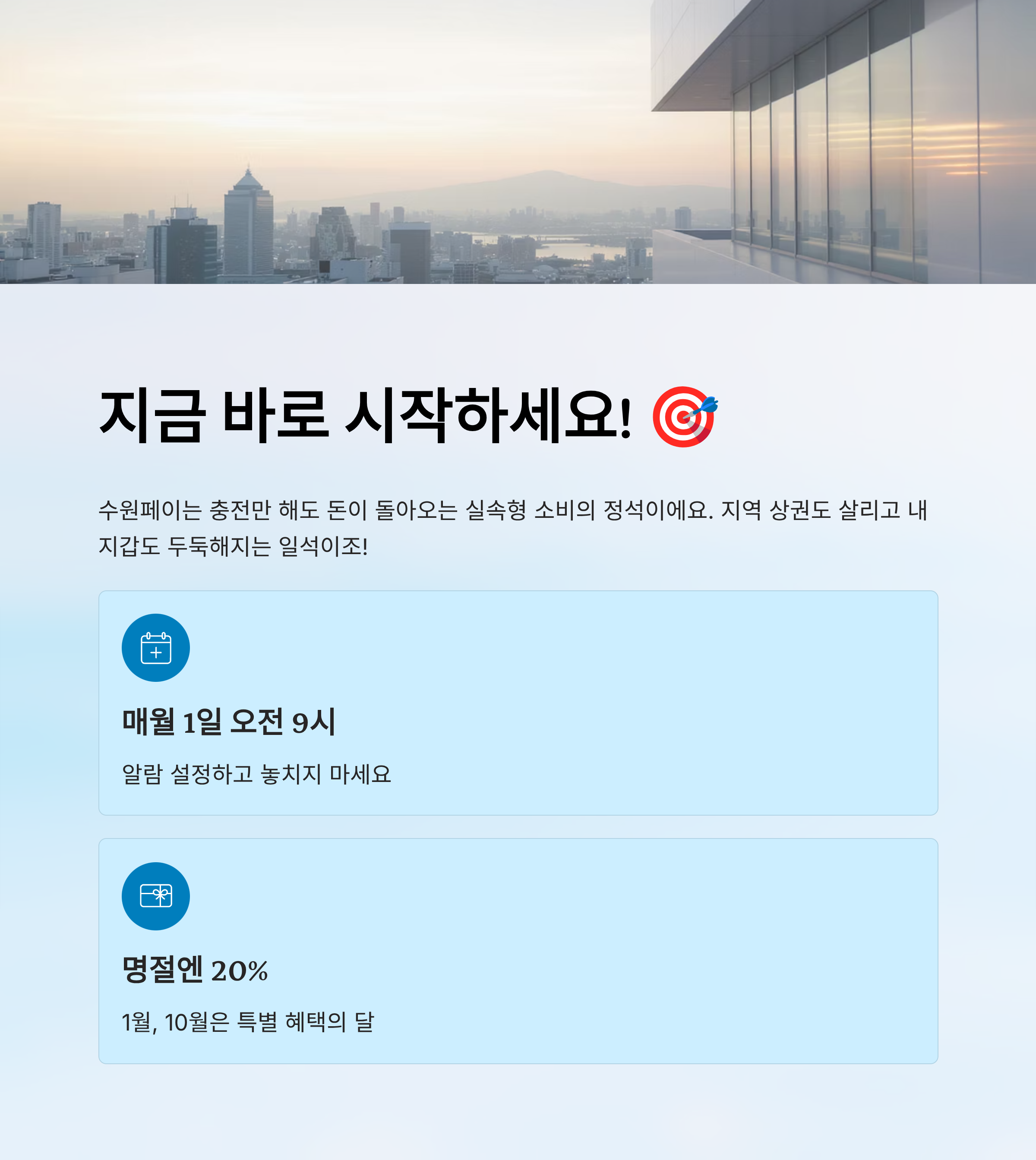 수원페이의 가장 큰 매력은 ‘충전만 해도’ 인센티브가 즉시 지급된다는 점이에요. 평소엔 10%, 명절엔 무려 20%까지! 예산이 정해져 있어 빨리 충전하지 않으면 놓치게 되니, 인센티브 지급일을 꼭 기억해야 해요. ⏰