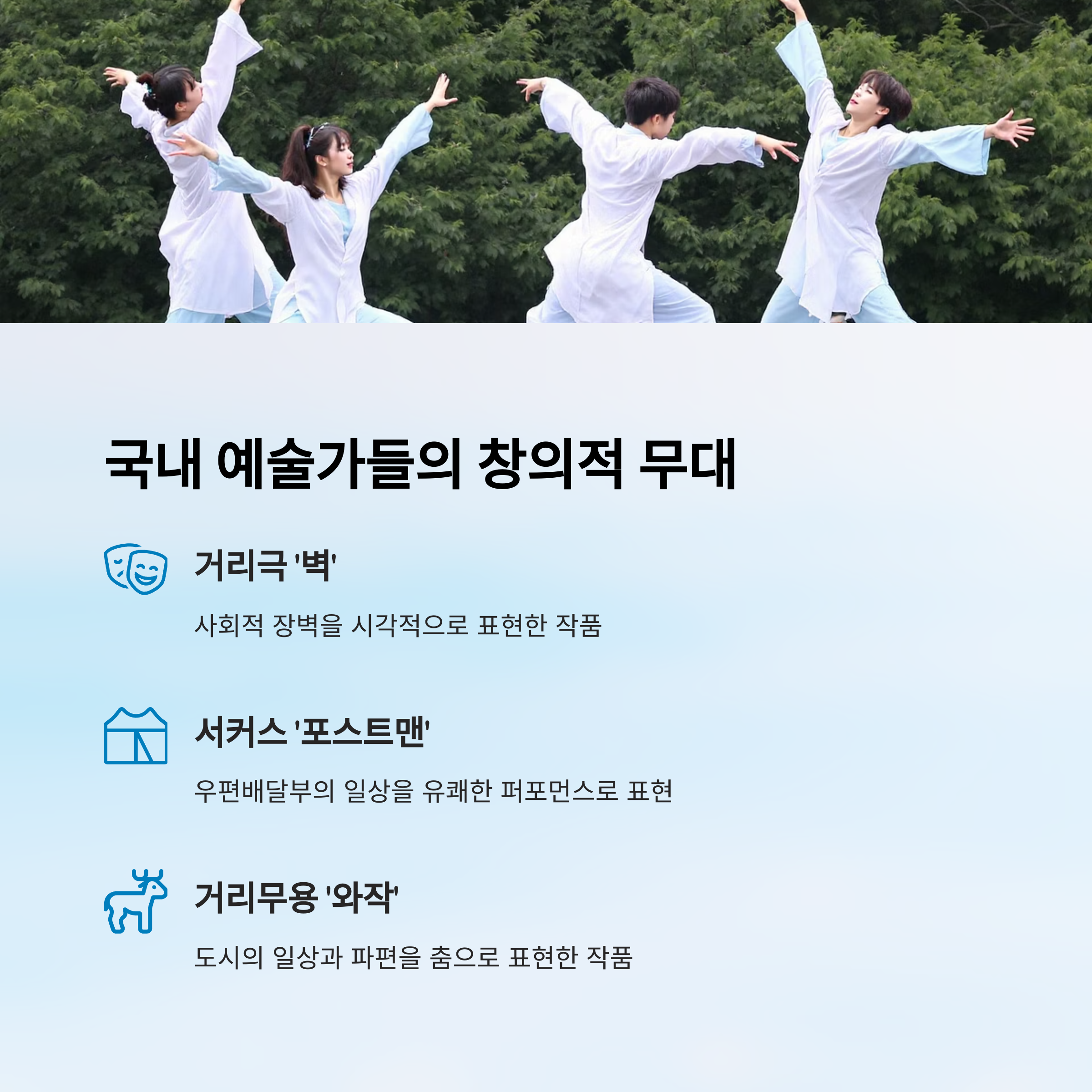 예를 들면, 거리극 ‘벽’은 사회적 장벽을 시각적으로 표현한 작품으로 관객에게 깊은 여운을 남겨줘요. 서커스 작품인 ‘포스트맨’은 우편배달부의 일상을 유쾌한 퍼포먼스로 그려내요. ‘체어, 테이블, 체어’는 가구와 인간의 관계를 유머러스하게 풀어내는 독특한 서커스예요.