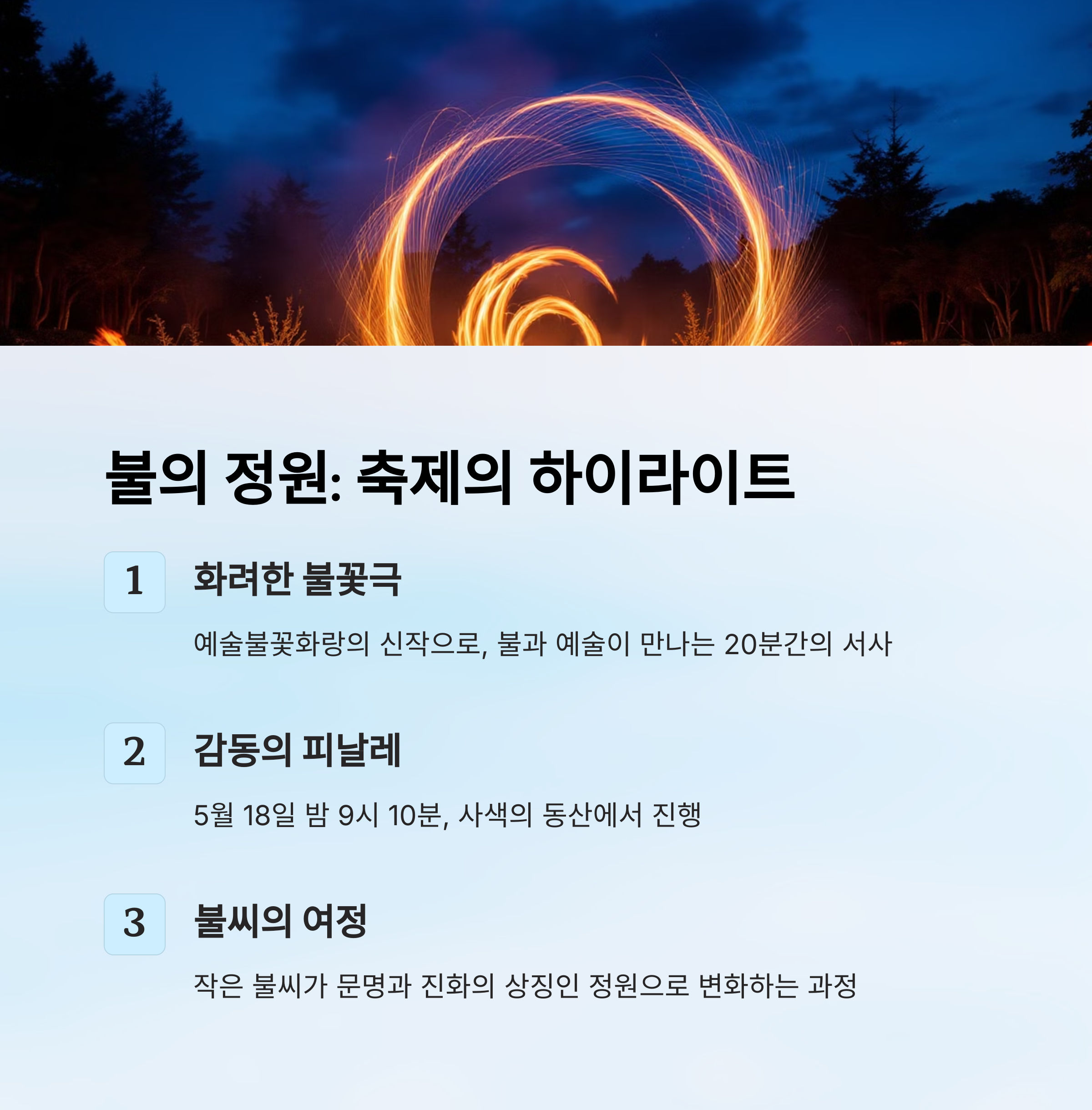 창작 불꽃극이 주는 감동은 정말 커요. 불이라는 매체를 예술로 풀어내는 방식이 독창적이고, 기술적 완성도도 높아요. 꼭 자리 잡고 보고 가길 추천해요! 🔥
