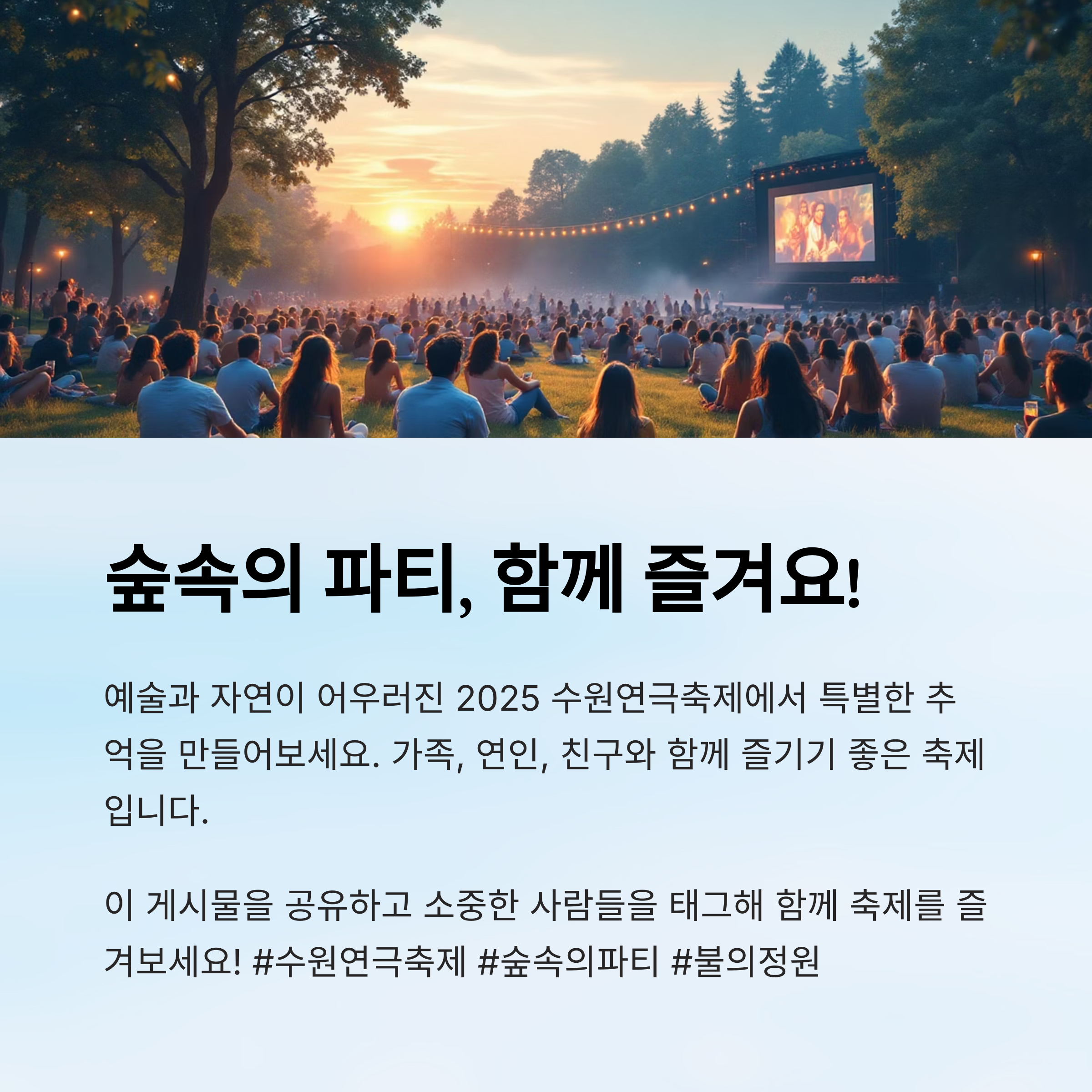 2025년 수원연극축제가 다시 돌아왔어요! ‘숲속의 파티’를 테마로 예술, 자연, 시민이 어우러지는 다채로운 야외 퍼포먼스를 만나볼 수 있는 축제랍니다. 국내외 거리극부터 창작 서커스, 무용, 음악극, 그리고 불꽃극까지 준비되어 있어요.