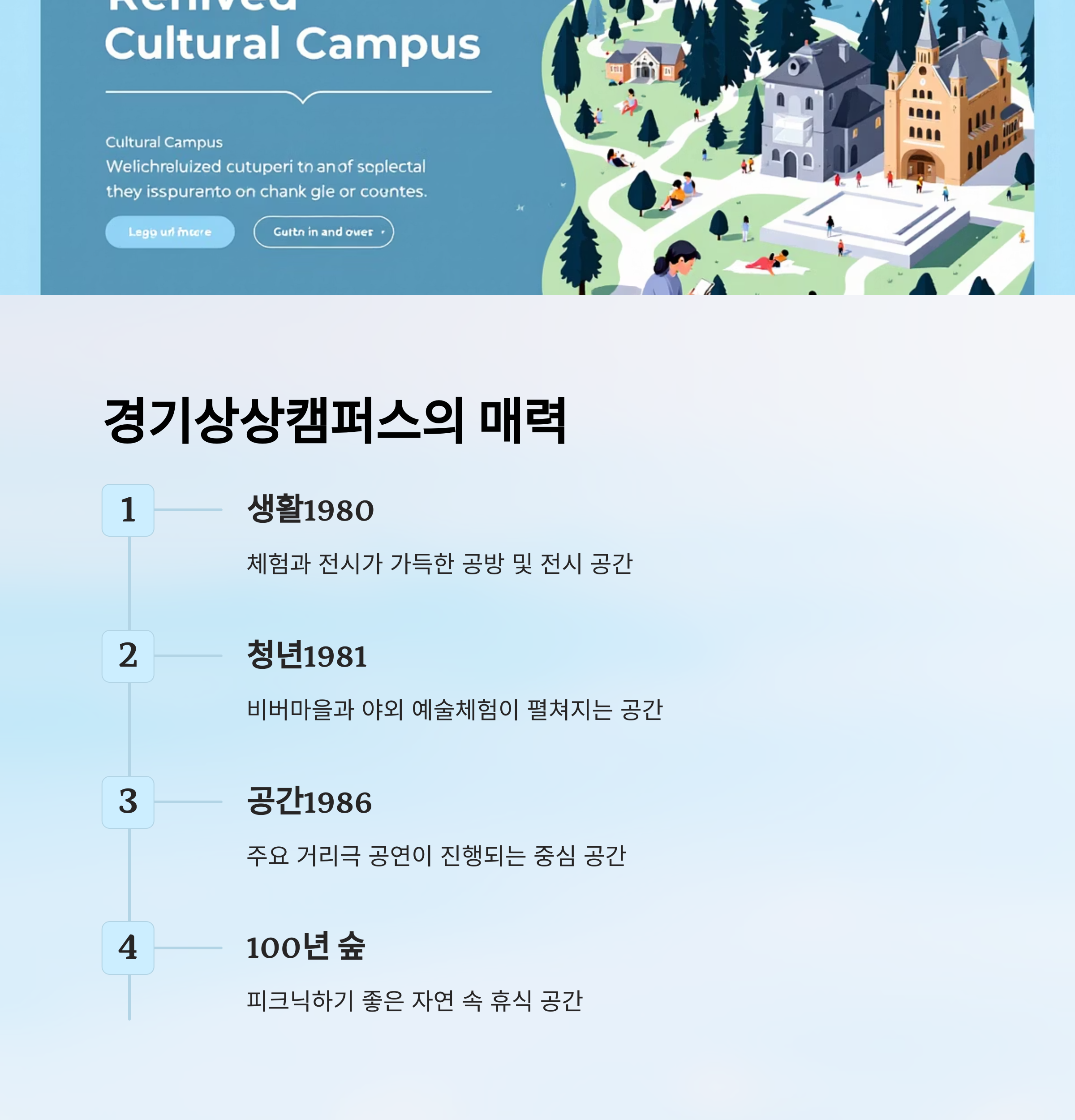 경기상상캠퍼스는 옛 서울대 농생대 부지를 리모델링해 만든 복합문화공간이에요. 넓은 잔디밭과 숲길, 다양한 예술공간이 있어서 평소에도 산책이나 소풍 장소로 유명하답니다. 축제 기간에는 이 공간 전체가 무대가 되는 셈이죠!