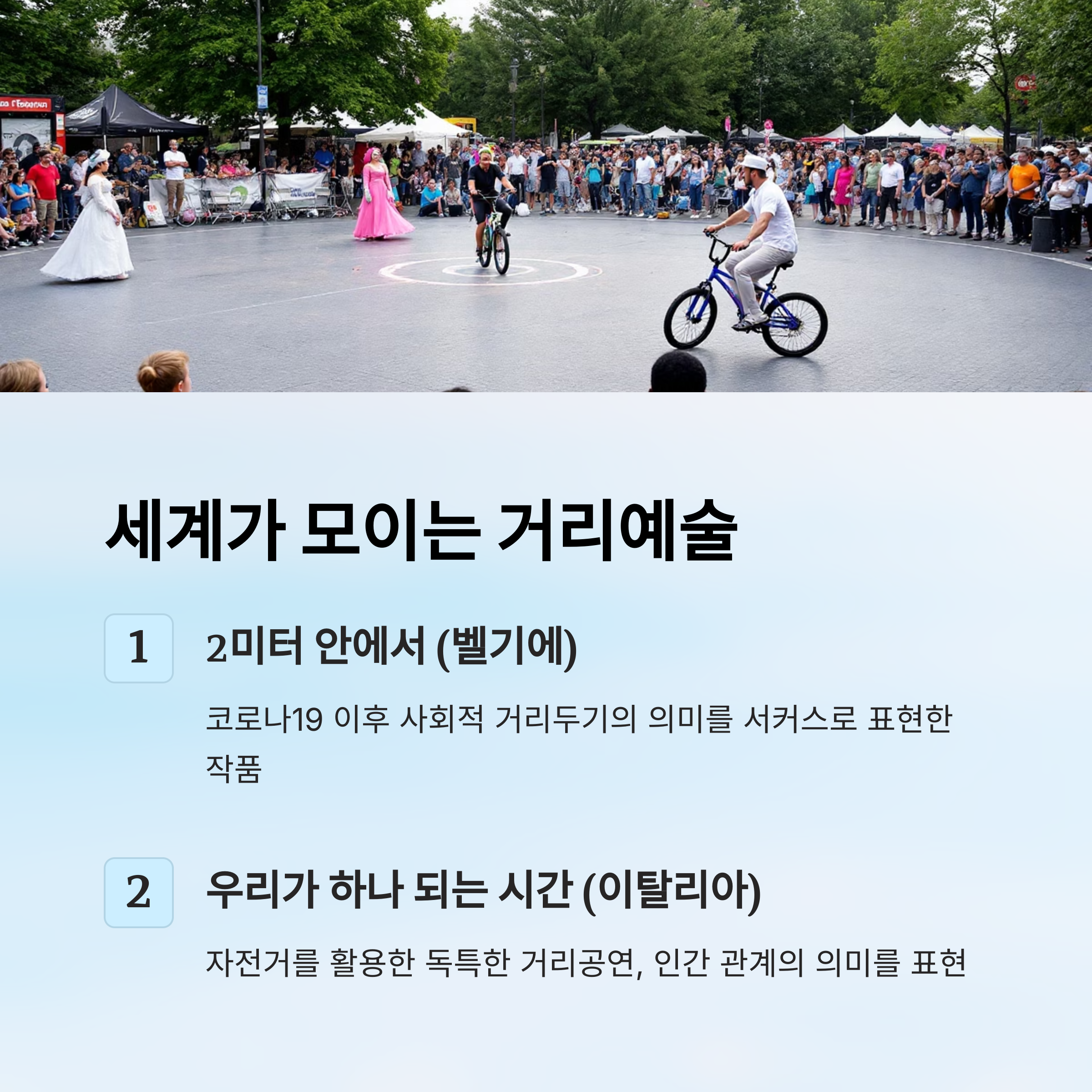 ‘우리가 하나 되는 시간’은 자전거를 활용한 독특한 거리공연이에요. 유쾌하고 위태로운 퍼포먼스를 통해 서로 연결되는 인간 관계의 의미를 표현한답니다. 🎪