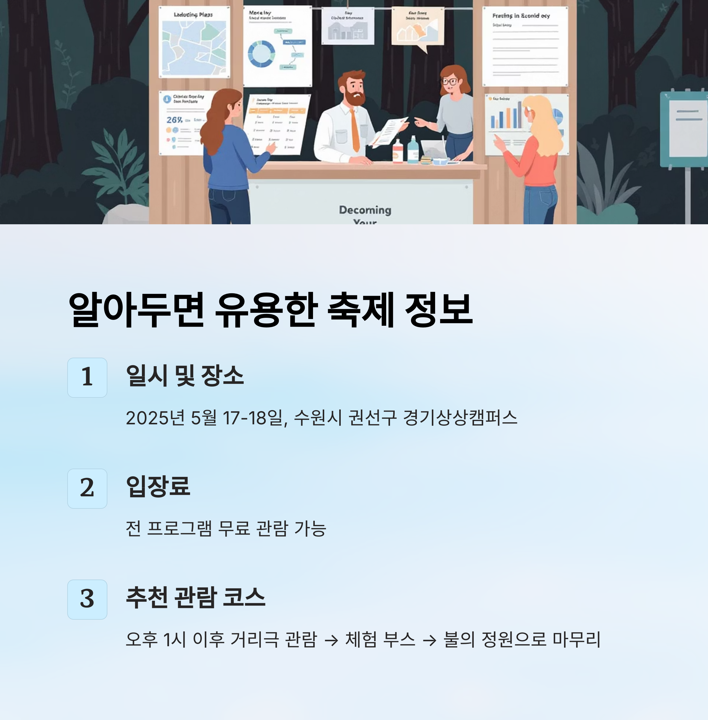 이번 축제는 5월 17일부터 18일까지 이틀 동안 수원시 권선구에 위치한 경기상상캠퍼스에서 진행돼요. 입장도 무료라서 가족, 연인, 친구와 함께 가볍게 즐기기에 딱이죠! 특히 제가 생각했을 때 하이라이트는 단연 ‘불의 정원’이에요. 🎆