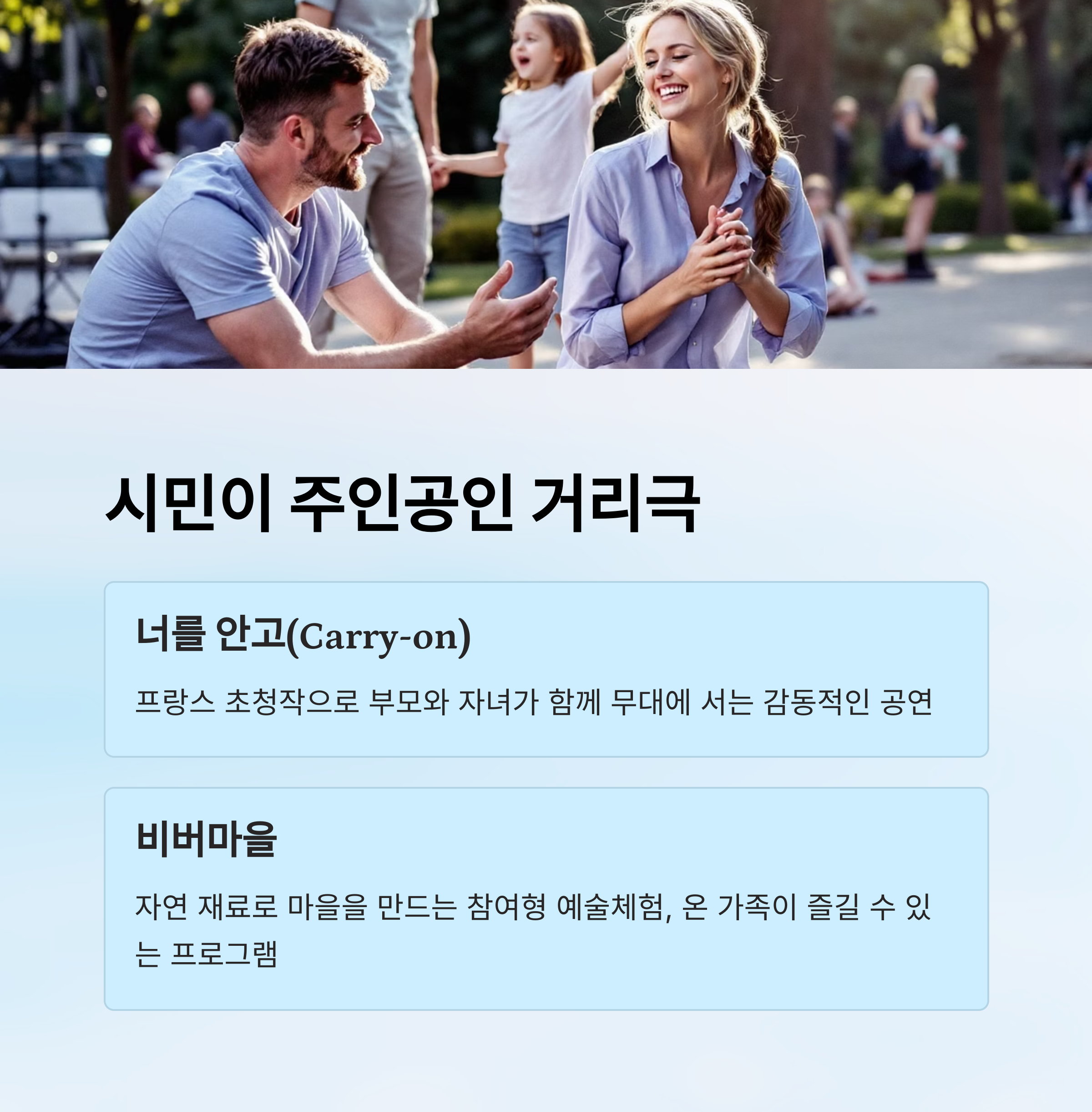 이 공연은 부모와 자녀가 한 팀이 되어 감정의 여정을 표현하는 작품이에요. 단순한 연극이 아니라 삶의 이야기를 몸짓과 움직임으로 풀어내기 때문에 관객들의 몰입도도 아주 높아요. 실제로 참여하는 시민 8팀이 무대에 올라가는 것도 인상 깊죠.
