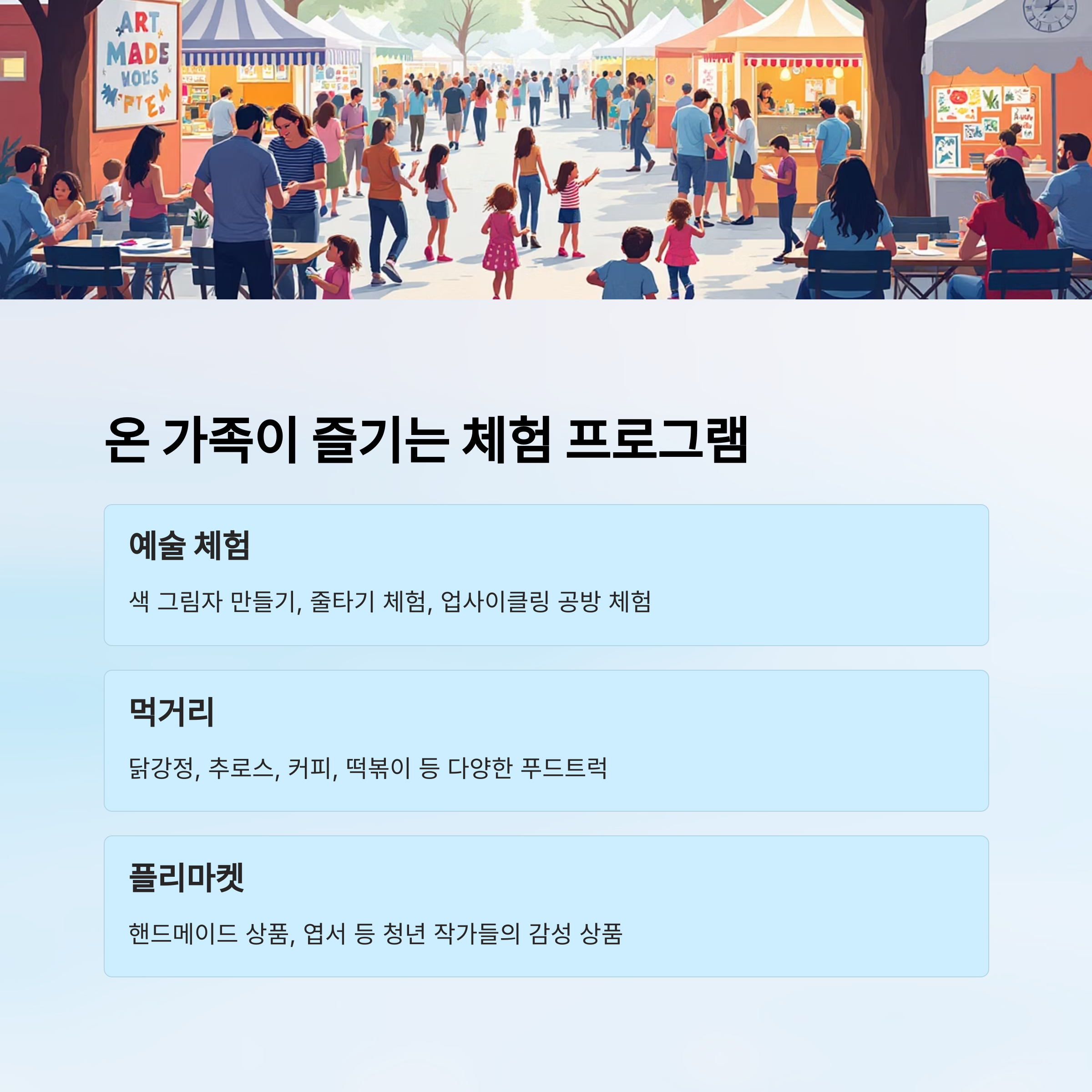 축제는 단순히 공연만 있는 게 아니에요! 다양한 체험 부스와 놀이 공간, 먹거리까지 준비돼 있어서 하루 종일 신나게 놀 수 있어요. 특히 아이들과 함께 온 가족 방문객에게는 더없이 좋은 시간이 될 거예요.