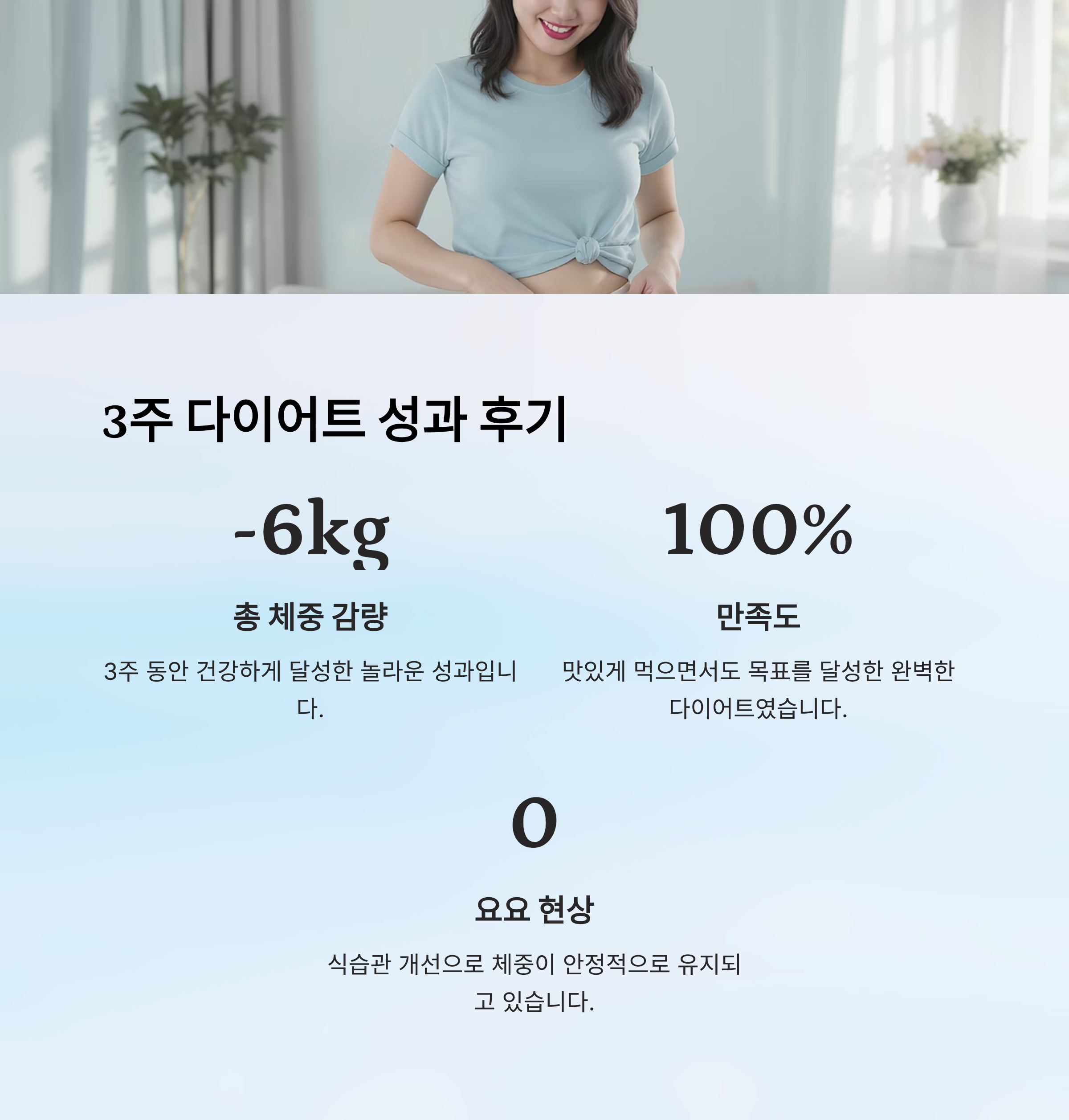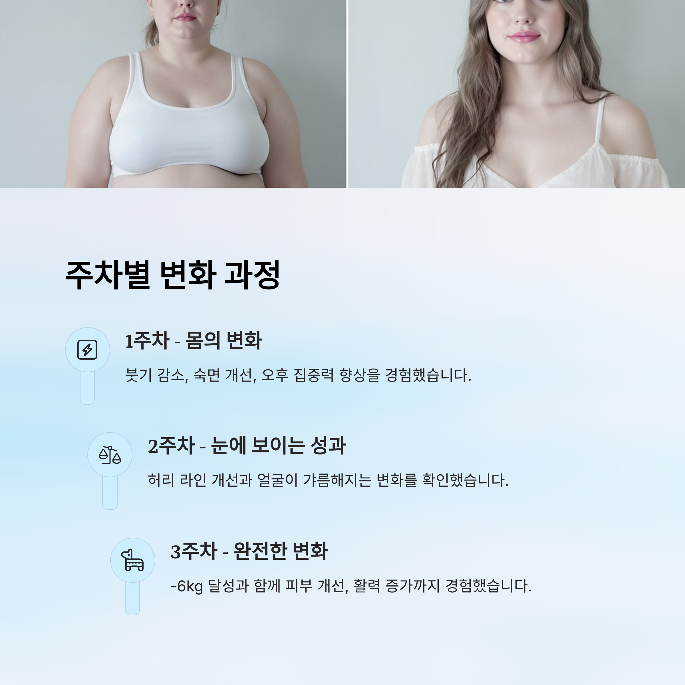 | 3주차 | -2.5kg | 체지방 감소 확실 | 피부 개선, 활력 증가 |