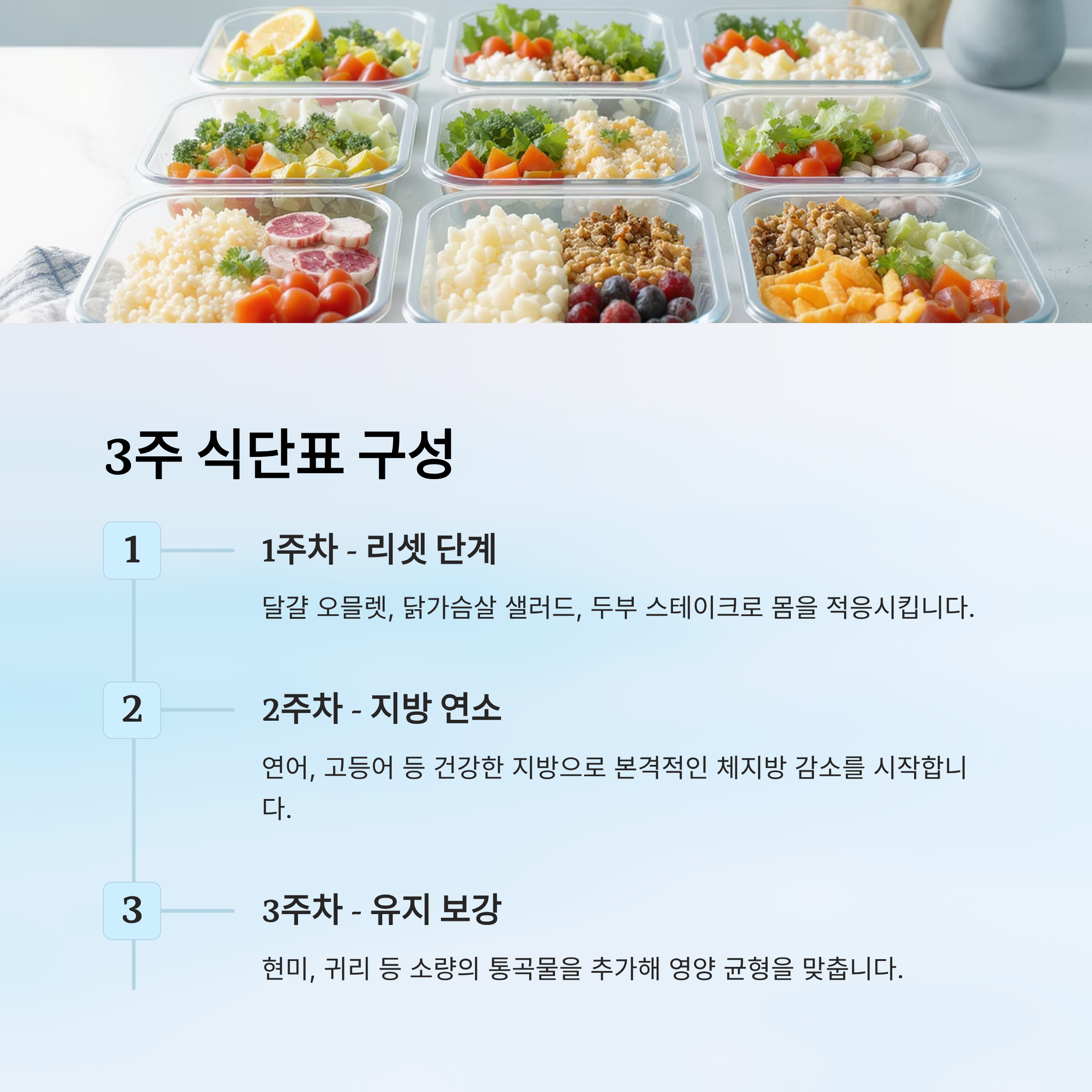3주차는 유지와 체력 보강 단계예요. 체중이 빠진 만큼 영양 균형이 무너지지 않도록 단백질, 지방, 소량의 복합 탄수화물을 조합해요. 현미나 귀리 같은 통곡물을 조금씩 추가하면 에너지를 보강하면서도 혈당을 안정적으로 유지할 수 있어요. 이 시기에는 운동과 병행하면 효과가 배가돼요. 🏃♀️