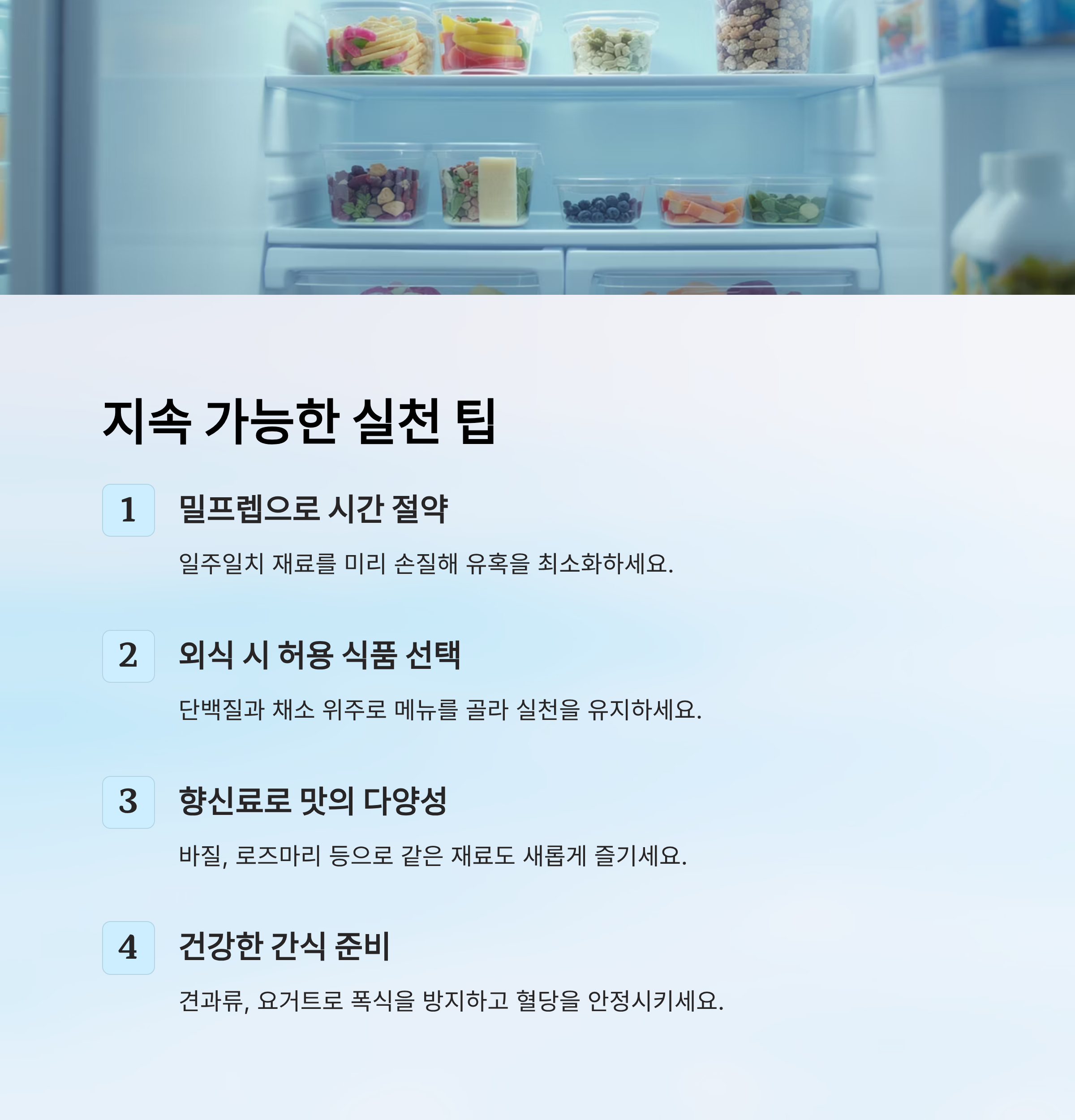 | 밀프렙 | 재료 미리 손질·보관 | 유혹 최소화, 시간 절약 |