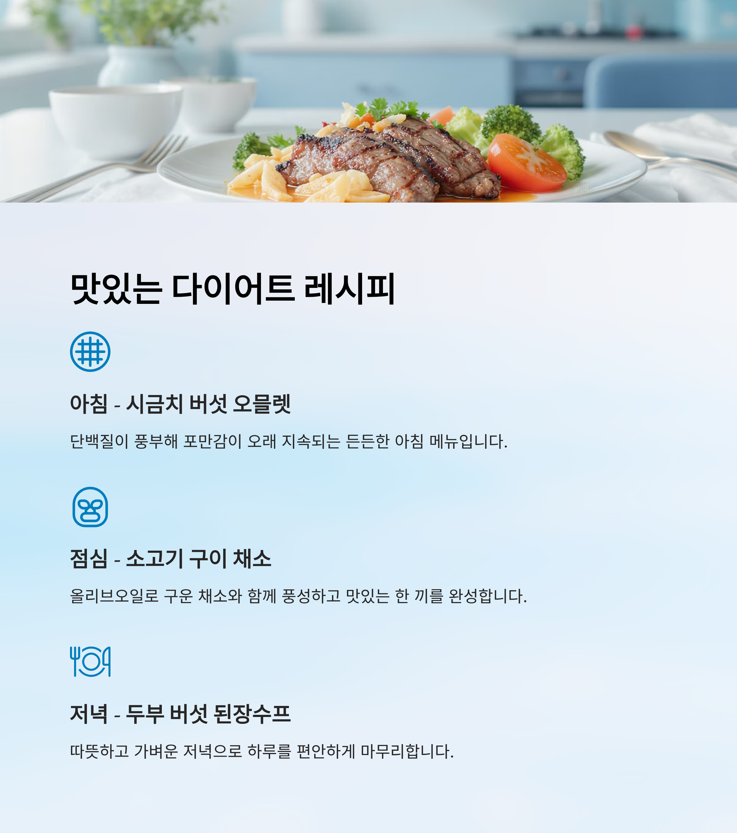 | 저녁 | 두부·버섯 된장수프 | 따뜻하고 가벼운 마무리 |