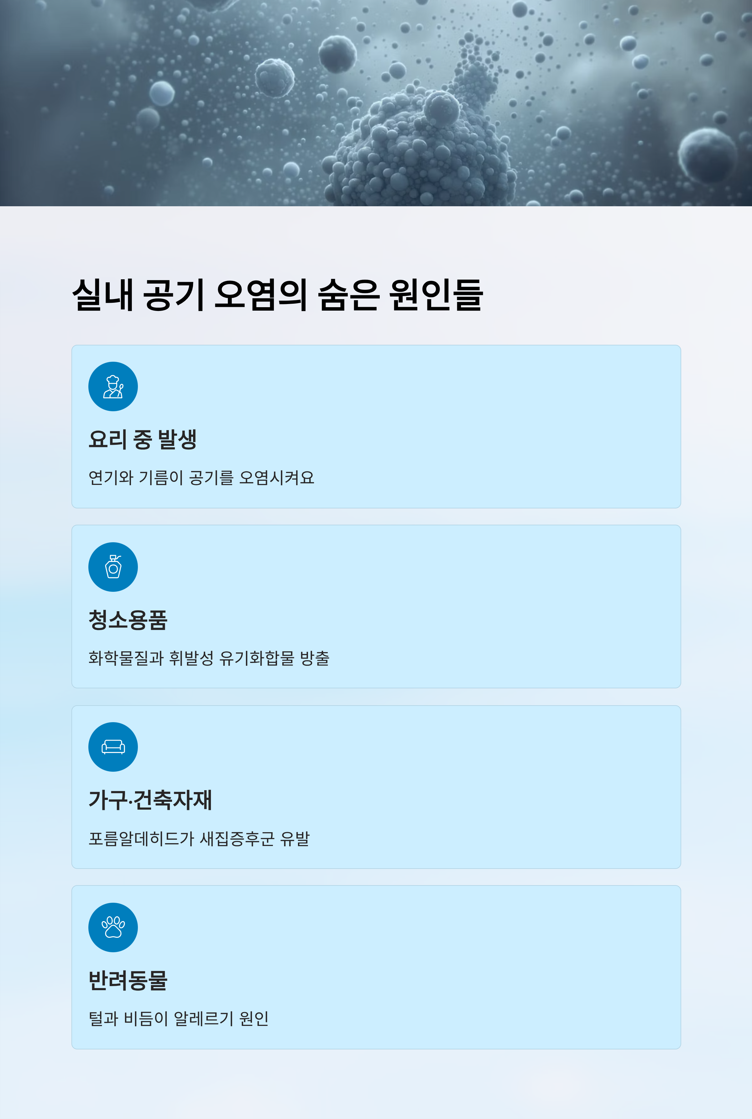 실내 공기 오염은 외부에서 유입되는 오염물질뿐만 아니라 내부에서 생성되는 다양한 요소들로부터 시작돼요. 예를 들면, 요리 시 발생하는 연기와 기름, 청소 용품에서 나오는 화학물질, 향초나 방향제의 휘발성 유기화합물 등이 주요 원인이에요.
