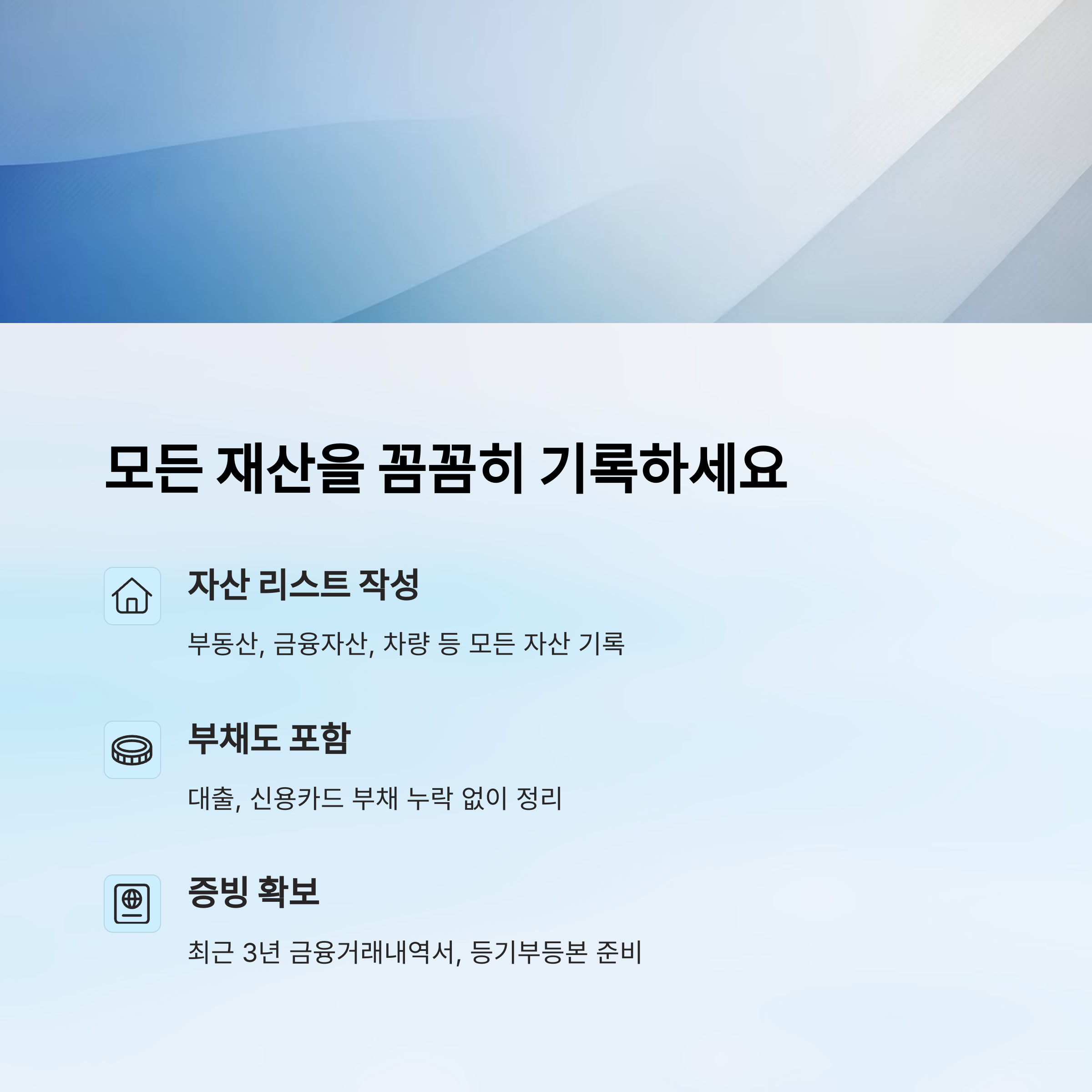 명확한 확인을 위해 등기부등본은 ‘갑구/을구’까지 꼭 확인하세요. 대출이나 압류가 잡혀 있는지도 확인할 수 있어요. 금융 자산은 은행이나 증권사에서 잔액증명서를 발급받아두면 증빙에 큰 도움이 돼요.