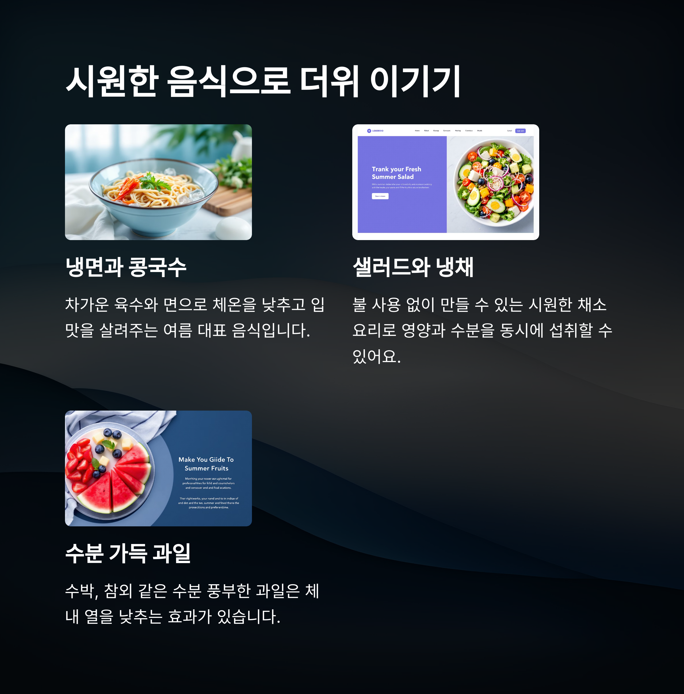 A6. 수박, 오이, 냉국, 샐러드, 콩국수 등이 시원하고 수분 보충에도 좋아요.