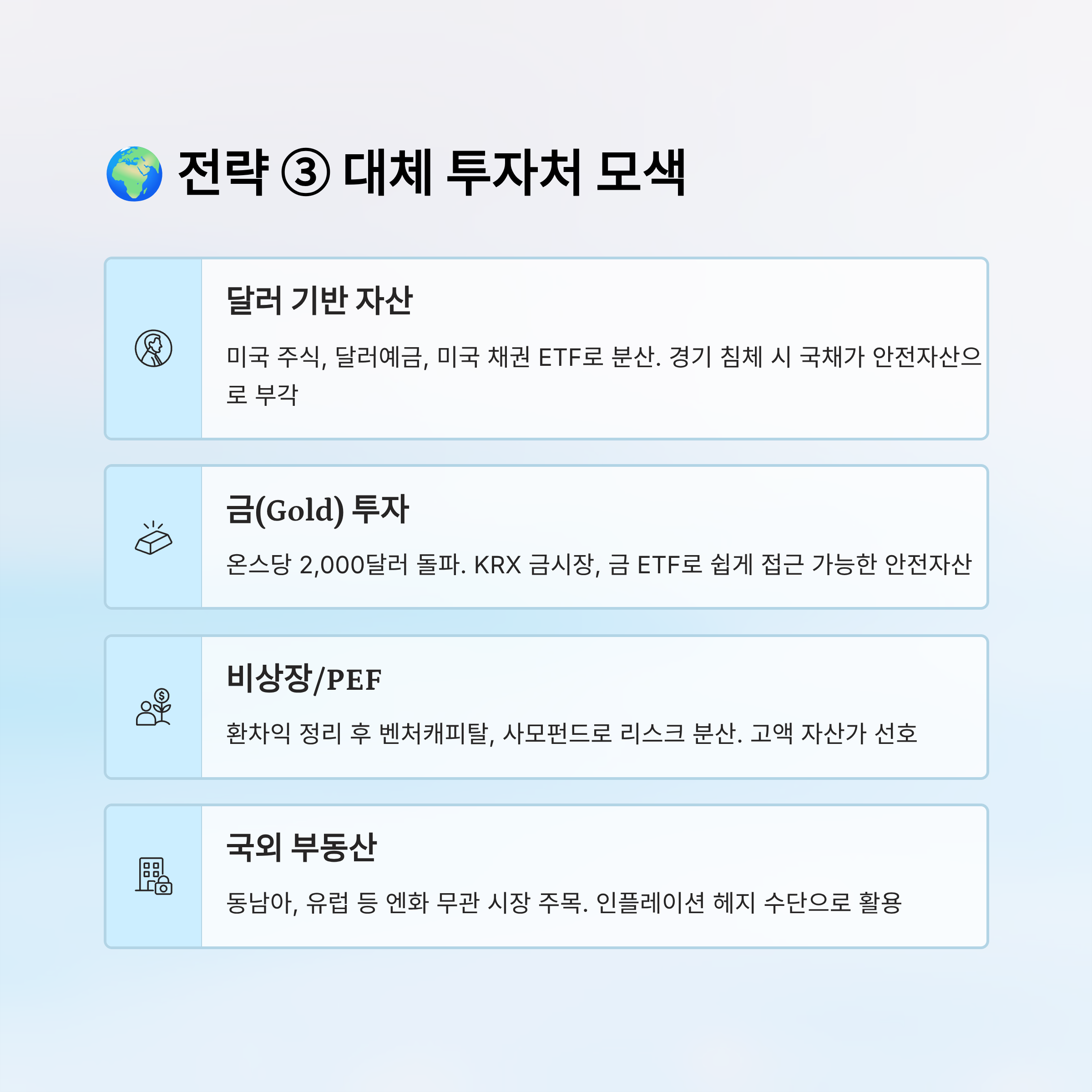 그 외에도 대체 투자처로 주목받는 게 바로 ‘비상장 투자’나 ‘사모펀드(PEF), 벤처캐피탈(VC)’ 등이에요. 특히 고액 자산가들은 이 시기를 활용해 엔화 자산 일부를 환차익으로 정리한 후, 새로운 비상장 기업 투자로 리스크를 분산하고 있어요. 물론 이 전략은 위험도 있으니 신중하게 접근해야 해요.