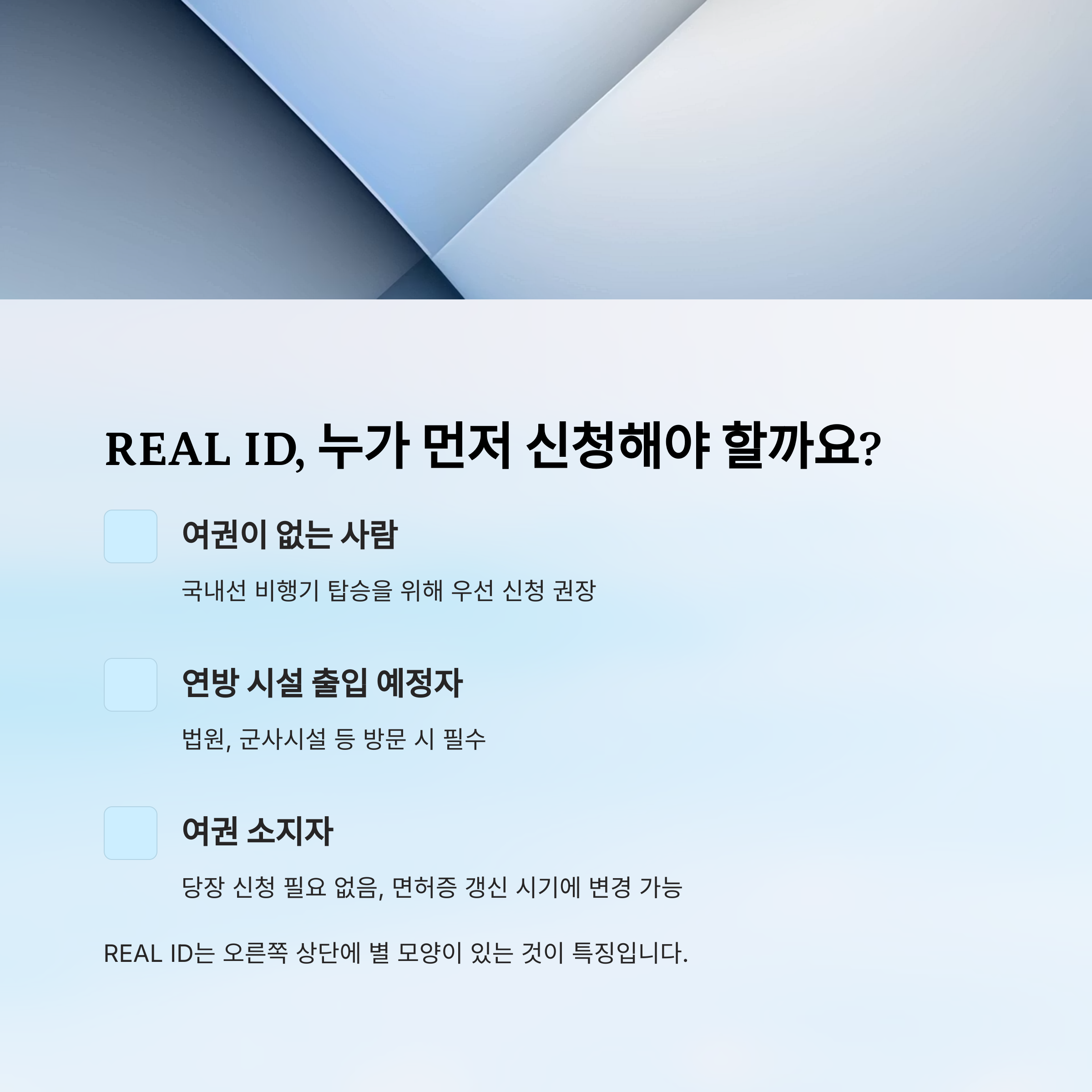 REAL ID는 미국 시민 누구나 신청할 수 있지만, 특히 우선적으로 신청해야 하는 사람들도 있어요. 그중 첫 번째는 유효한 미국 여권이나 연방정부에서 승인한 신분증이 없는 사람이에요. 이들은 국내선 비행기를 이용하거나 연방 시설을 방문하려면 반드시 REAL ID가 필요하답니다.
