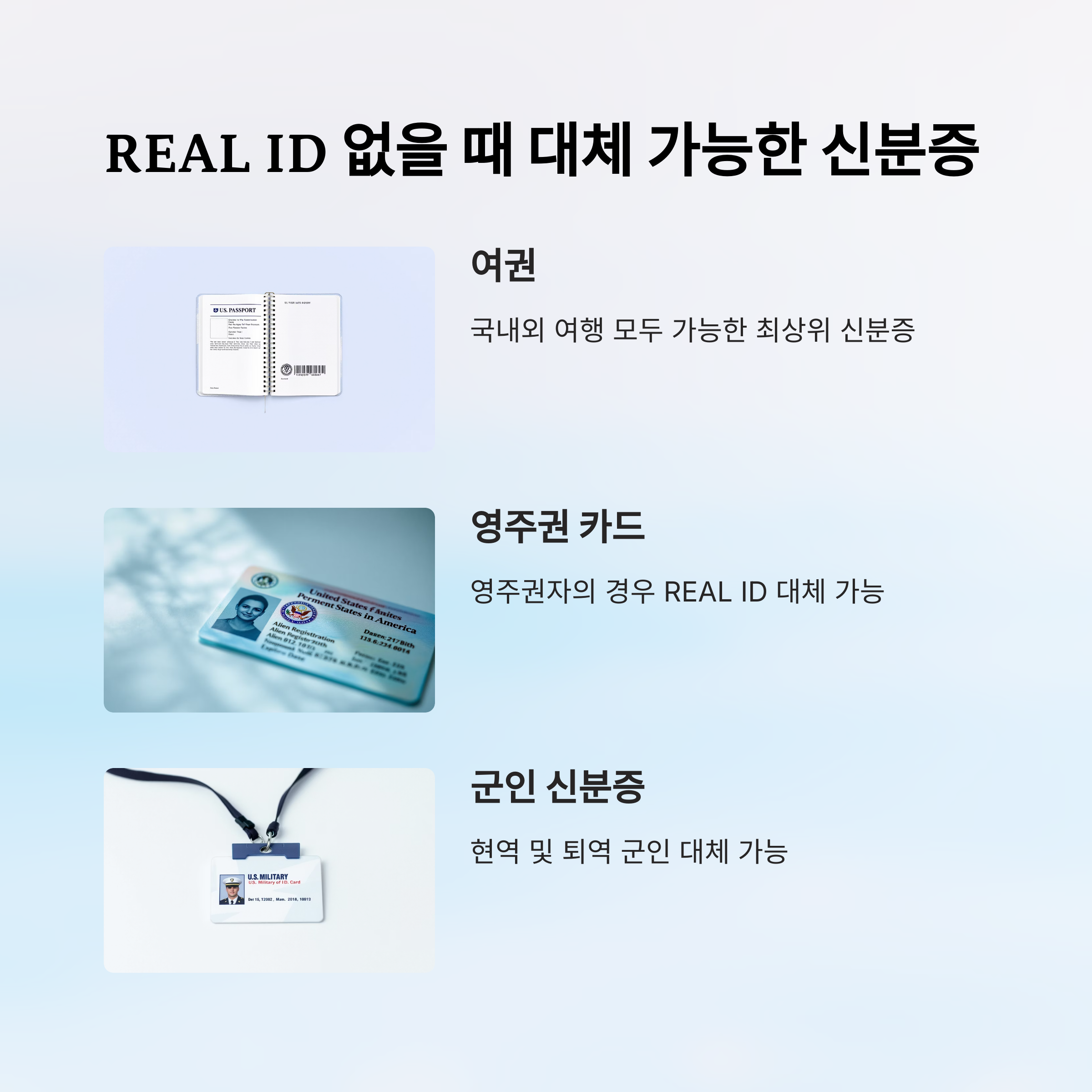 혹시 REAL ID를 아직 신청하지 못했거나, 발급 전에 비행기나 연방 시설을 이용해야 할 경우엔 대체 가능한 신분증을 사용하는 방법이 있어요.