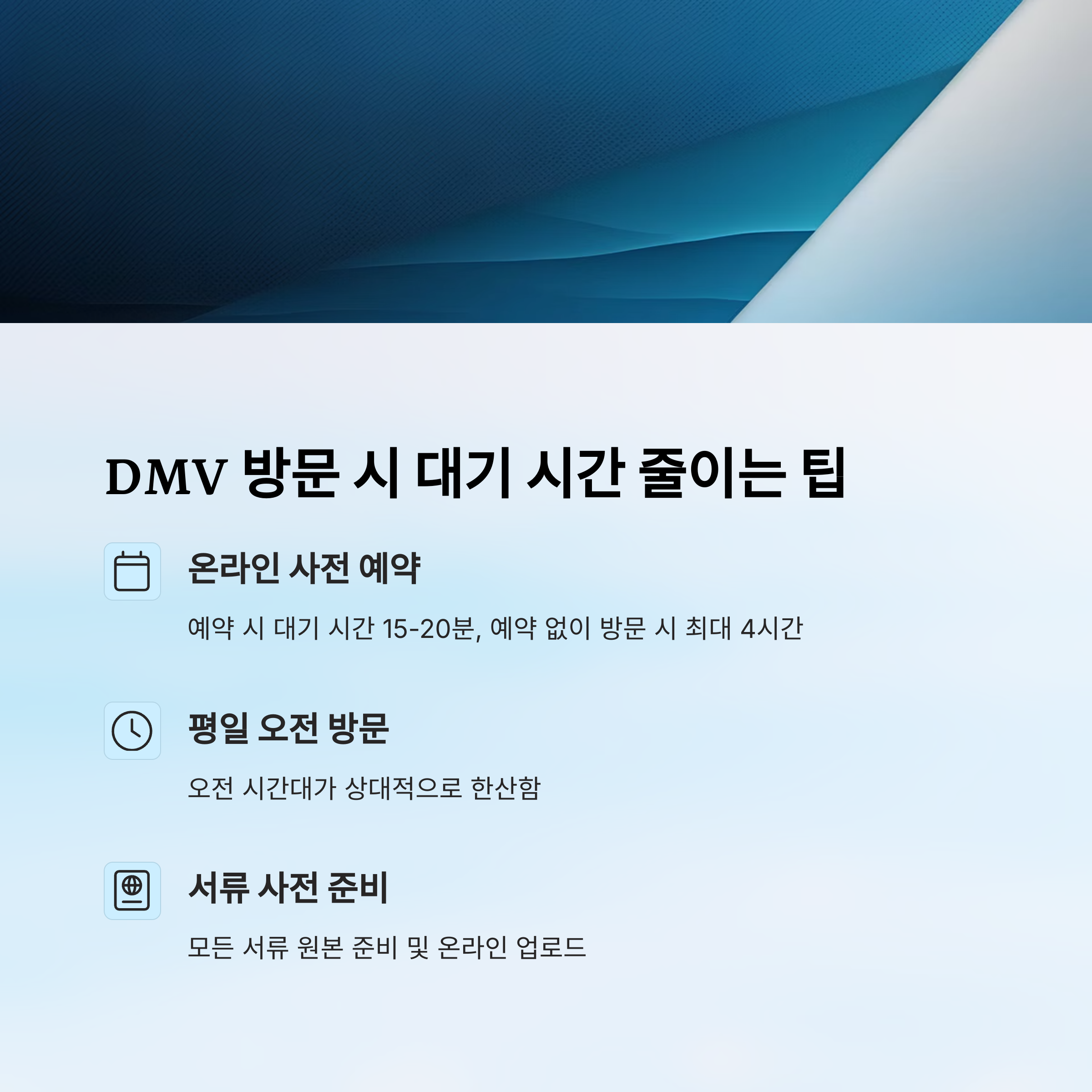DMV가 붐비지 않는 비성수기나 평일 오전을 활용하면 더 빠르게 신청할 수 있어요. 미리 준비하면 불편함 없이 여행과 업무를 이어갈 수 있답니다!