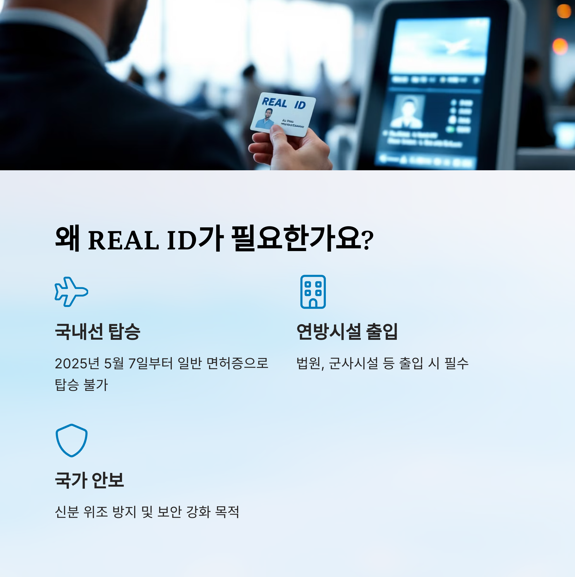 REAL ID는 미국 연방정부의 신분증 표준 규정으로, 2025년 5월 7일부터 국내선 비행기 탑승이나 연방시설 출입 시 반드시 필요해요. 유효한 여권이나 연방 승인 신분증이 없는 사람은 이 REAL ID를 반드시 신청해야 하죠.